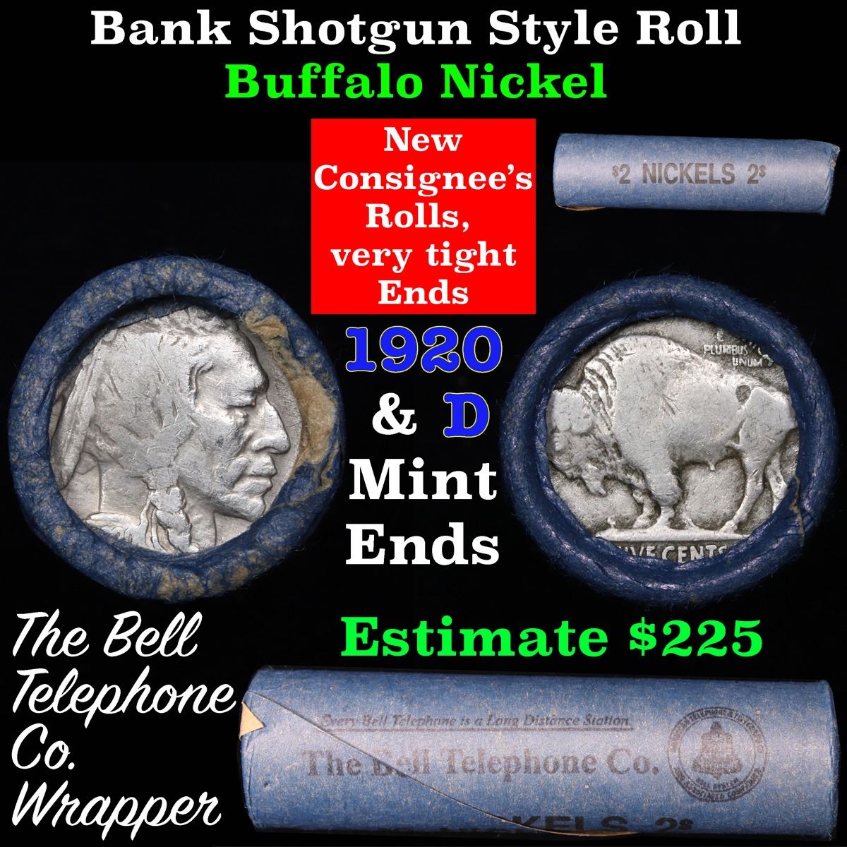 Buffalo Nickel Shotgun Roll in Old Bank Style 'Bell Telephone' Wrapper 1920 & d Mint Ends. The roll is held in an old, rare "Bell Telephone Co." Bank style wrapper. This is the Bell Telephone logo from the 1960's. They are all frrom one Estate. The ends on these rolls are very tight. We will guarantee they are all full dates.
