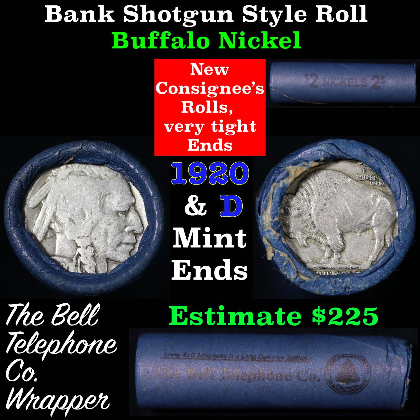 Buffalo Nickel Shotgun Roll in Old Bank Style 'Bell Telephone' Wrapper 1920 & d Mint Ends. The roll is held in an old, rare "Bell Telephone Co." Bank style wrapper. This is the Bell Telephone logo from the 1960's. They are all frrom one Estate. The ends on these rolls are very tight. We will guarantee they are all full dates.