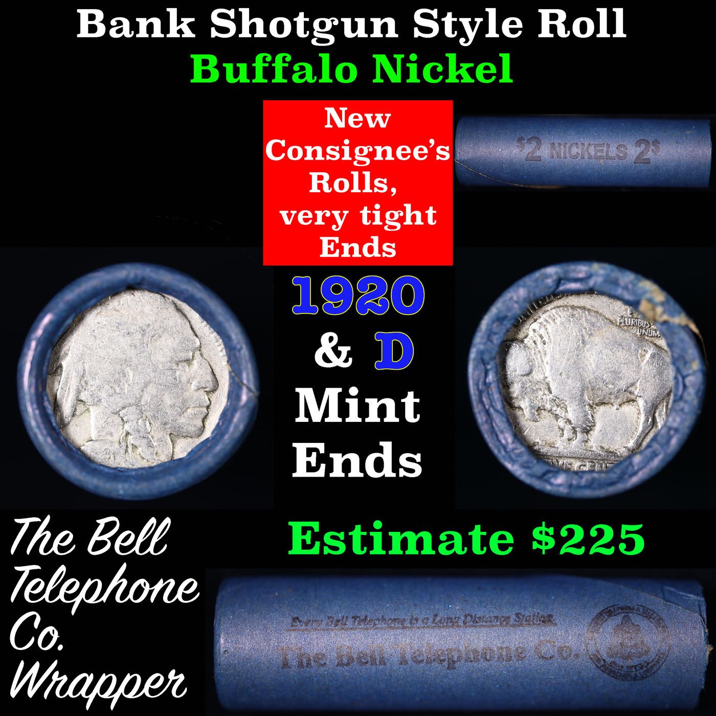 Buffalo Nickel Shotgun Roll in Old Bank Style 'Bell Telephone' Wrapper 1920 & d Mint Ends. 0 The roll is held in an old, rare "Bell Telephone Co." Bank style wrapper. This is the Bell Telephone logo from the 1960's. They are all frrom one Estate. The ends on these rolls are very tight. We will guarantee they are all full dates.
