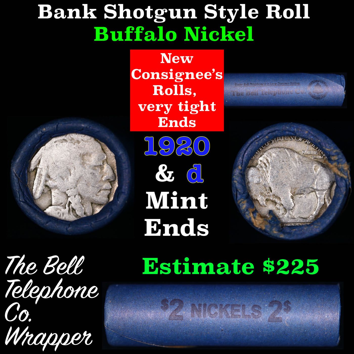 Buffalo Nickel Shotgun Roll in Old Bank Style 'Bell Telephone' Wrapper 1920 & d Mint Ends. The roll is held in an old, rare "Bell Telephone Co." Bank style wrapper. This is the Bell Telephone logo from the 1960's. They are all frrom one Estate. The ends on these rolls are very tight. We will guarantee they are all full dates.