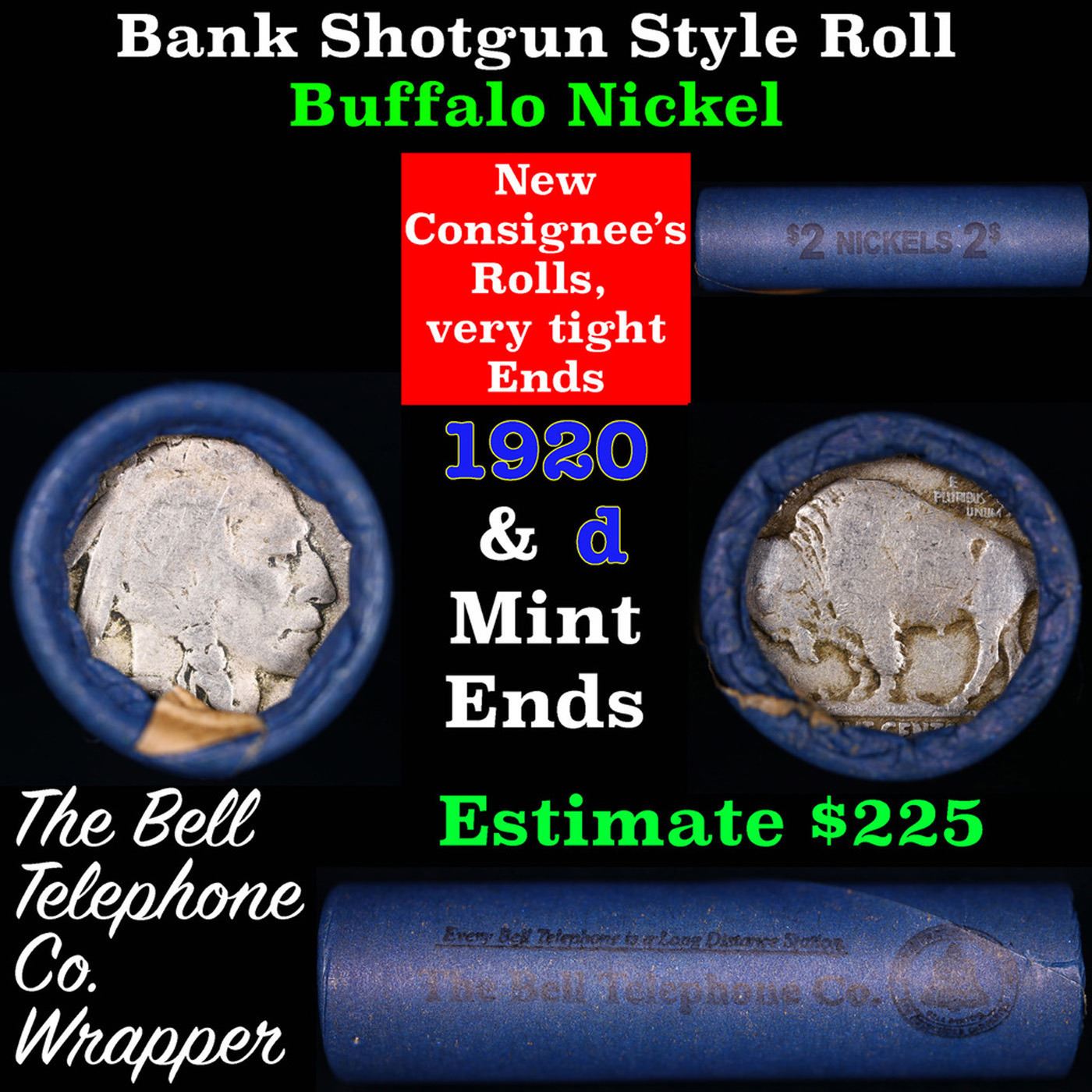 Buffalo Nickel Shotgun Roll in Old Bank Style 'Bell Telephone' Wrapper 1920 & d Mint Ends. The roll is held in an old, rare "Bell Telephone Co." Bank style wrapper. This is the Bell Telephone logo from the 1960's. They are all frrom one Estate. The ends on these rolls are very tight. We will guarantee they are all full dates.