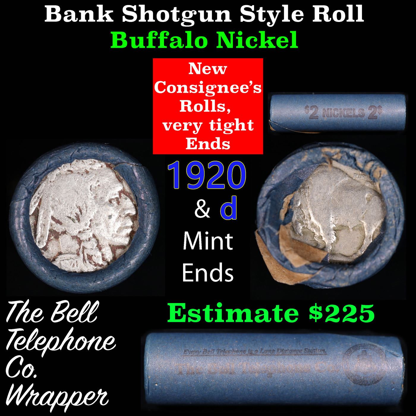 Buffalo Nickel Shotgun Roll in Old Bank Style 'Bell Telephone' Wrapper 1920 & d Mint Ends. The roll is held in an old, rare "Bell Telephone Co." Bank style wrapper. This is the Bell Telephone logo from the 1960's. They are all frrom one Estate. The ends on these rolls are very tight. We will guarantee they are all full dates.