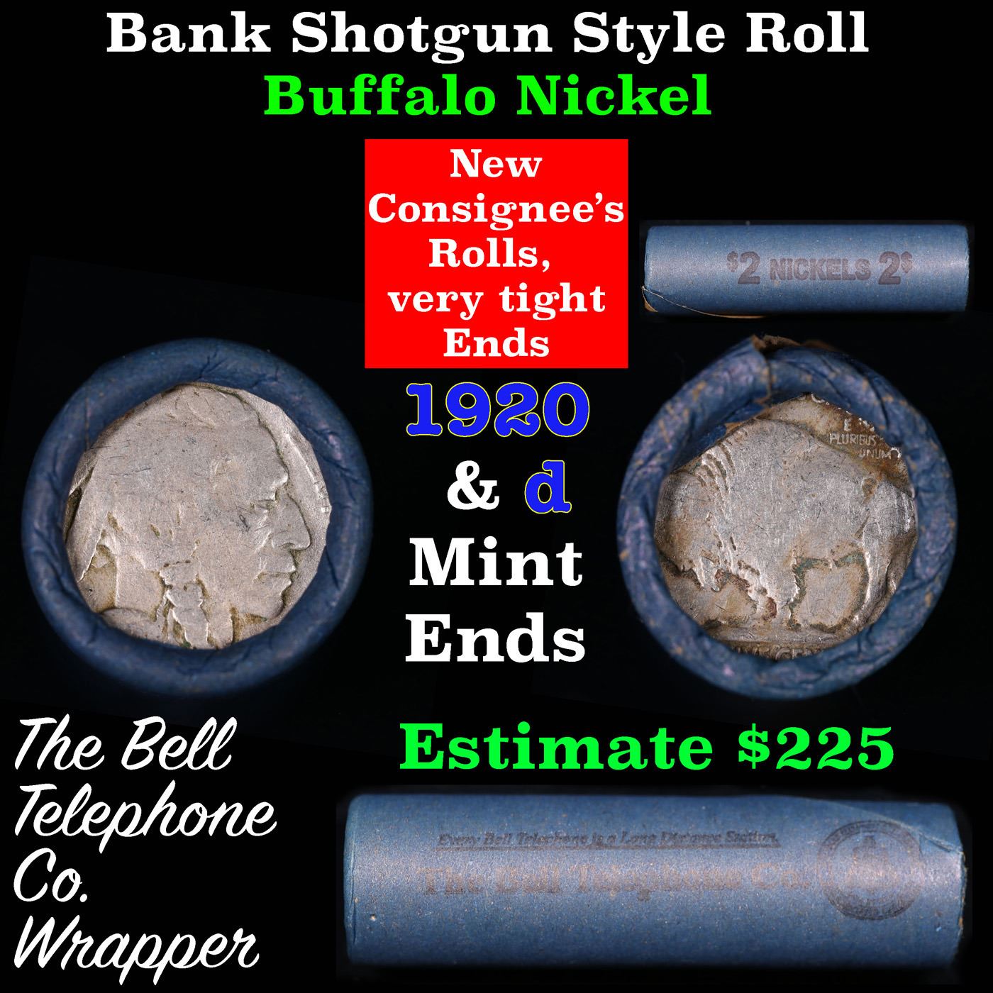 Buffalo Nickel Shotgun Roll in Old Bank Style 'Bell Telephone' Wrapper 1920 & d Mint Ends. The roll is held in an old, rare "Bell Telephone Co." Bank style wrapper. This is the Bell Telephone logo from the 1960's. They are all frrom one Estate. The ends on these rolls are very tight. We will guarantee they are all full dates.