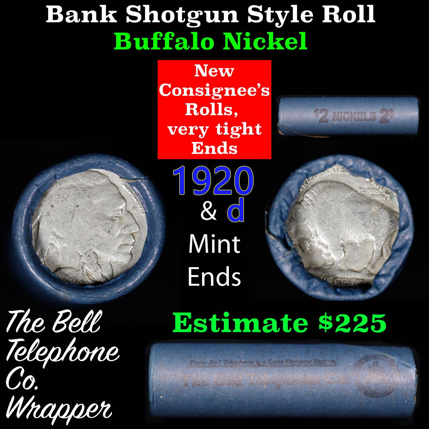 Buffalo Nickel Shotgun Roll in Old Bank Style 'Bell Telephone' Wrapper 1920 &d Mint Ends. The roll is held in an old, rare "Bell Telephone Co." Bank style wrapper. This is the Bell Telephone logo from the 1960's. They are all frrom one Estate. The ends on these rolls are very tight. We will guarantee they are all full dates.