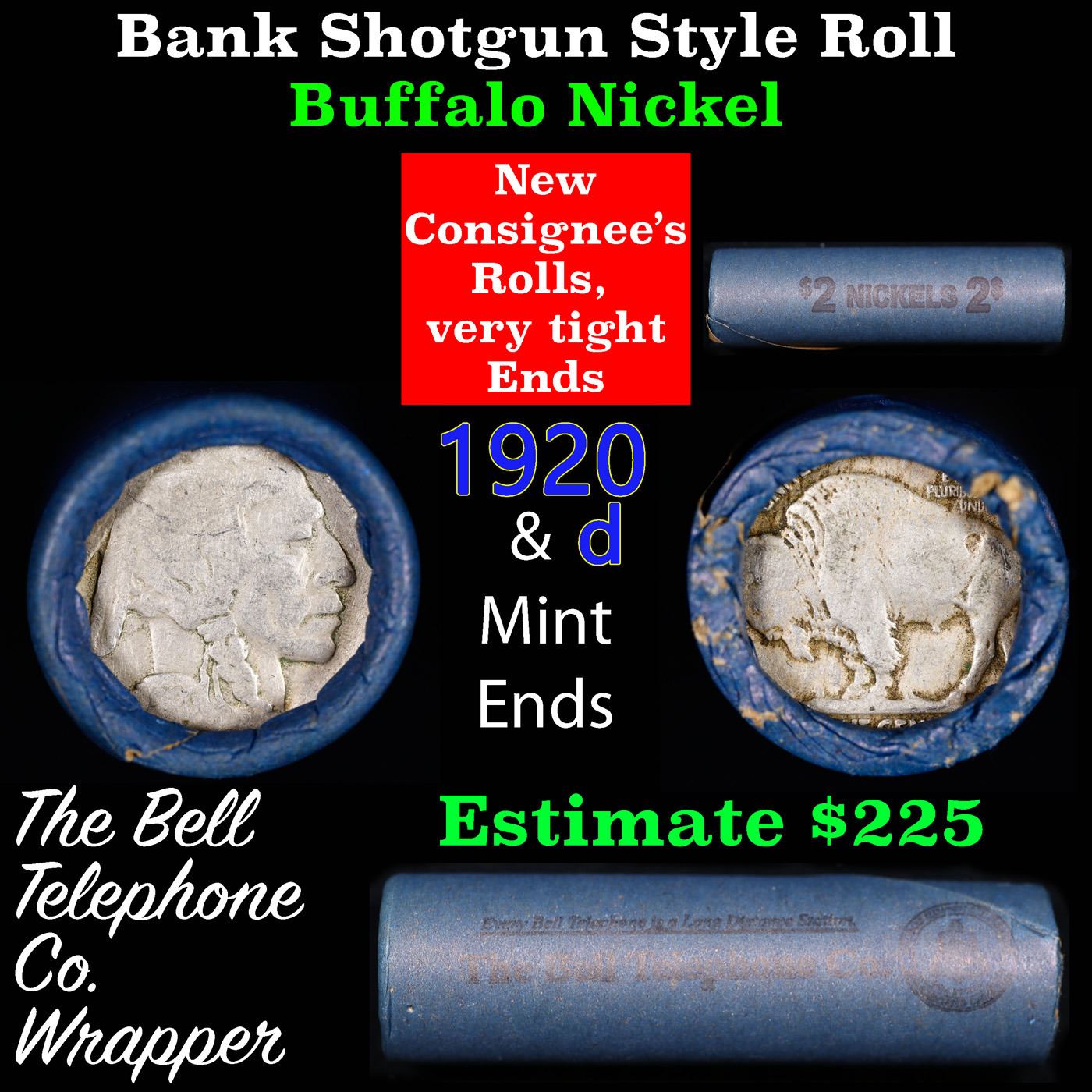 Buffalo Nickel Shotgun Roll in Old Bank Style 'Bell Telephone' Wrapper 1920 &d Mint Ends. The roll is held in an old, rare "Bell Telephone Co." Bank style wrapper. This is the Bell Telephone logo from the 1960's. They are all frrom one Estate. The ends on these rolls are very tight. We will guarantee they are all full dates.