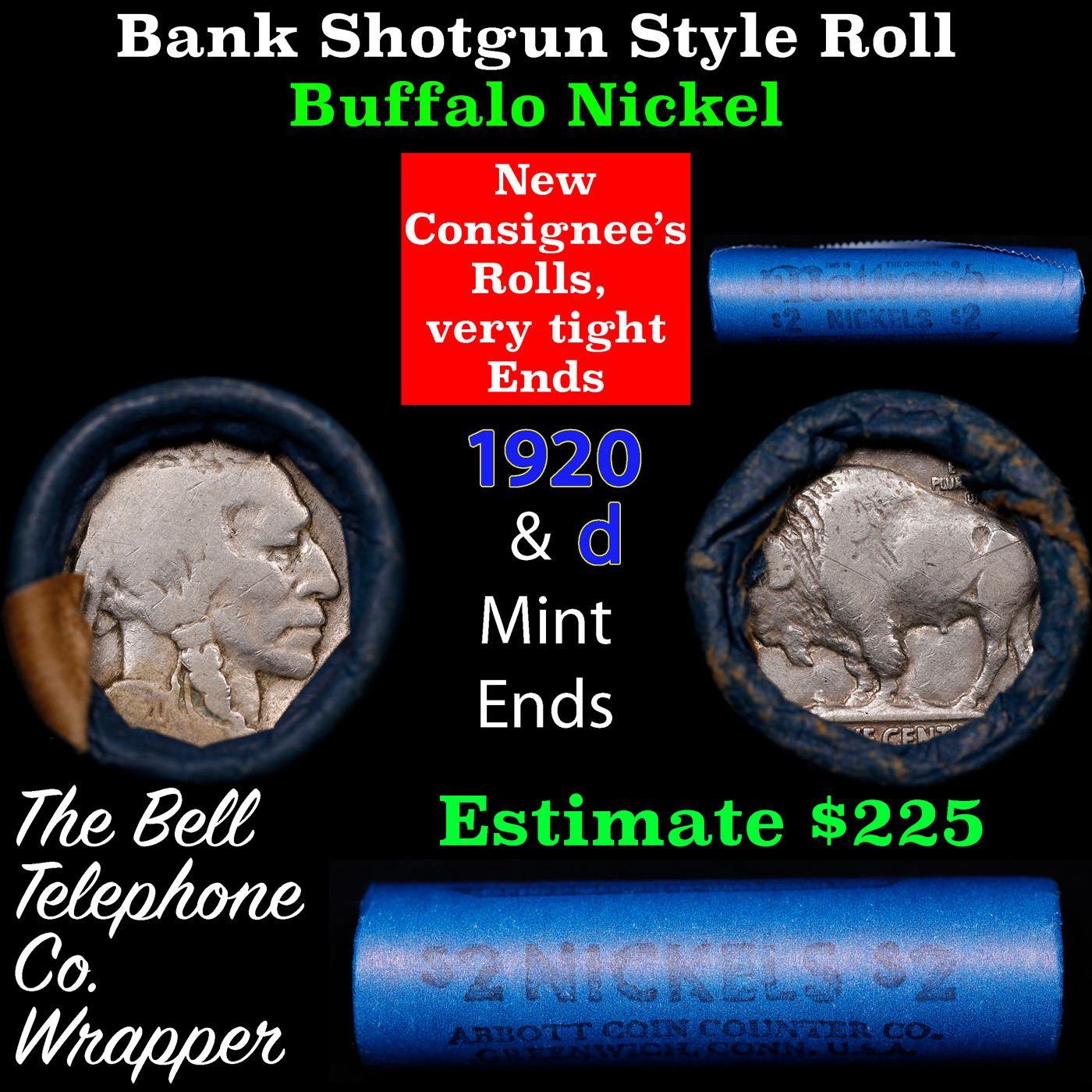 Buffalo Nickel Shotgun Roll in Old Bank Style 'Bell Telephone' Wrapper 1920 &d Mint Ends. The roll is held in an old, rare "Bell Telephone Co." Bank style wrapper. This is the Bell Telephone logo from the 1960's. They are all frrom one Estate. The ends on these rolls are very tight. We will guarantee they are all full dates.