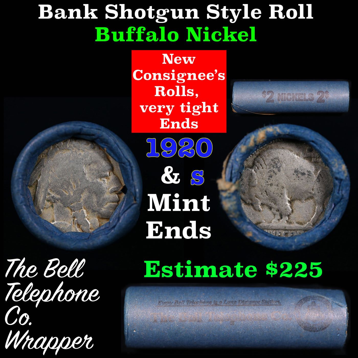 Buffalo Nickel Shotgun Roll in Old Bank Style 'Bell Telephone' Wrapper 1920 &s Mint Ends Grades. The roll is held in an old, rare "Bell Telephone Co." Bank style wrapper. This is the Bell Telephone logo from the 1960's. They are all frrom one Estate. The ends on these rolls are very tight. We will guarantee they are all full dates.