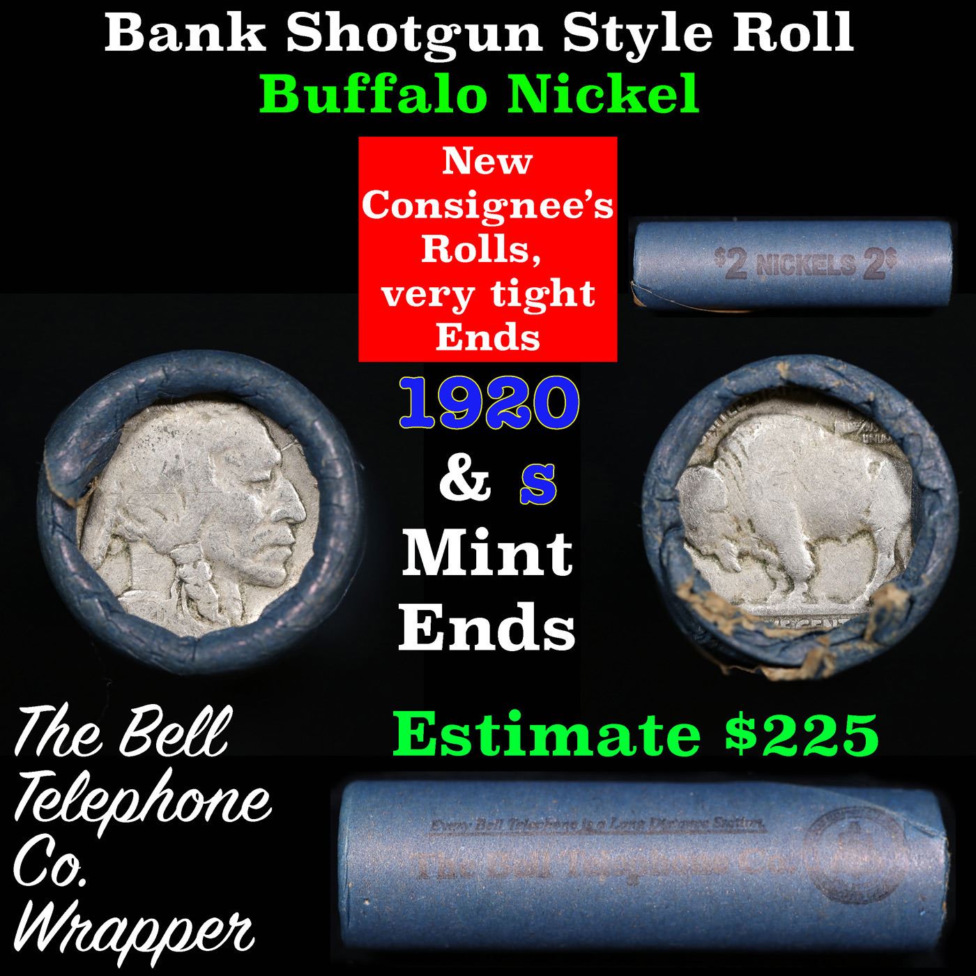 Buffalo Nickel Shotgun Roll in Old Bank Style 'Bell Telephone' Wrapper 1920 &s Mint Ends Grades. The roll is held in an old, rare "Bell Telephone Co." Bank style wrapper. This is the Bell Telephone logo from the 1960's. They are all frrom one Estate. The ends on these rolls are very tight. We will guarantee they are all full dates.