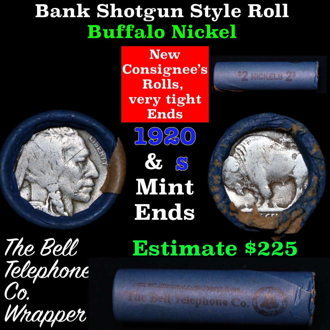 Buffalo Nickel Shotgun Roll in Old Bank Style 'Bell Telephone' Wrapper 1920 & s Mint Ends. The roll is held in an old, rare "Bell Telephone Co." Bank style wrapper. This is the Bell Telephone logo from the 1960's. They are all frrom one Estate. The ends on these rolls are very tight. We will guarantee they are all full dates.