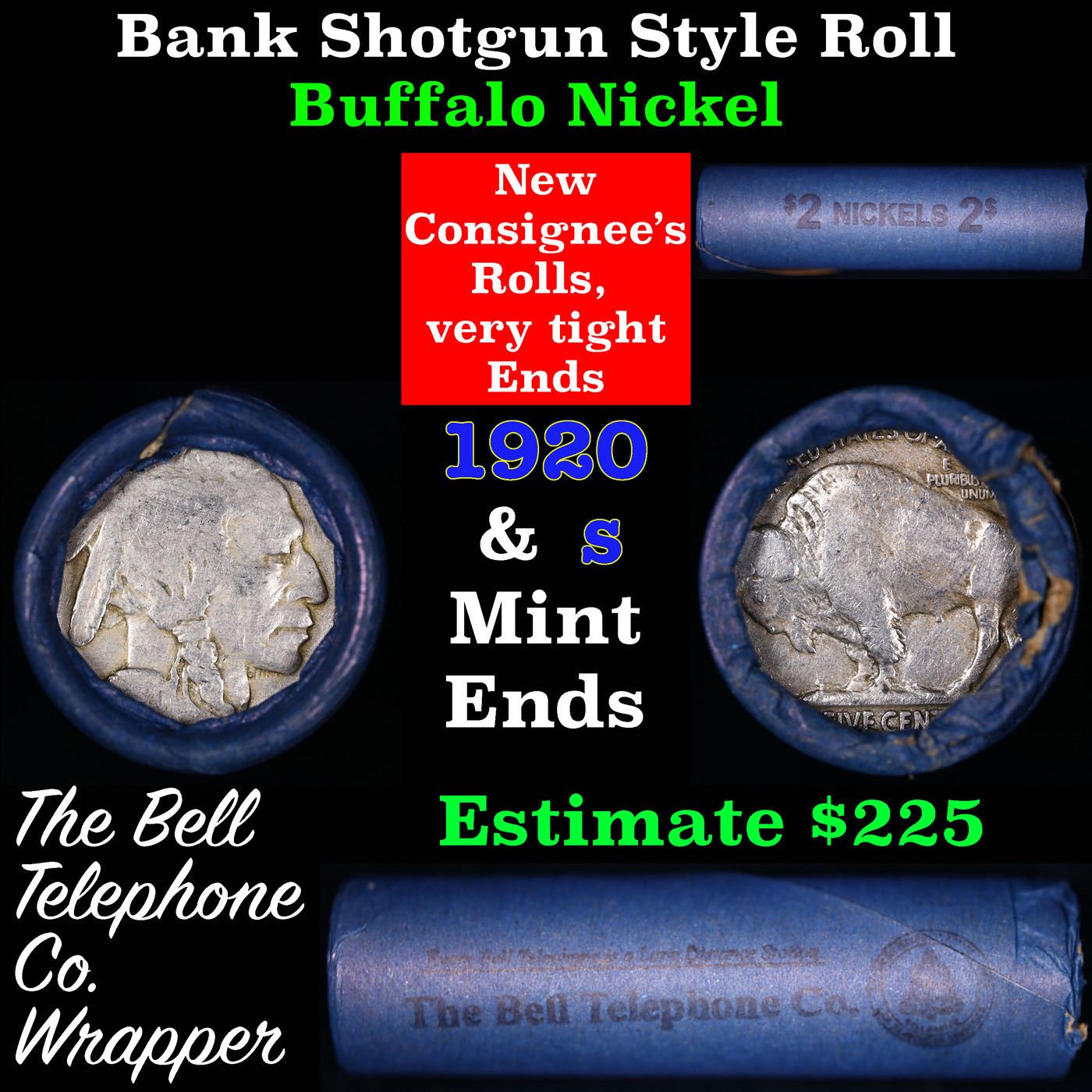 Buffalo Nickel Shotgun Roll in Old Bank Style 'Bell Telephone' Wrapper 1920 & s Mint Ends. The roll is held in an old, rare "Bell Telephone Co." Bank style wrapper. This is the Bell Telephone logo from the 1960's. They are all frrom one Estate. The ends on these rolls are very tight. We will guarantee they are all full dates.