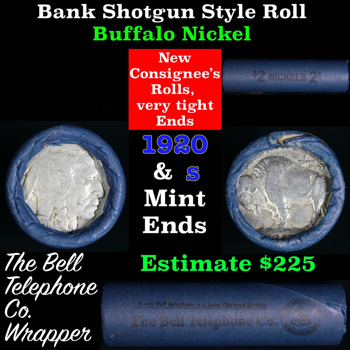 Buffalo Nickel Shotgun Roll in Old Bank Style 'Bell Telephone' Wrapper 1920 &s Mint Ends. The roll is held in an old, rare "Bell Telephone Co." Bank style wrapper. This is the Bell Telephone logo from the 1960's. They are all frrom one Estate. The ends on these rolls are very tight. We will guarantee they are all full dates.