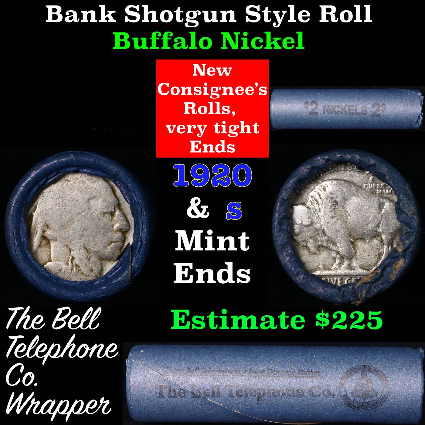 Buffalo Nickel Shotgun Roll in Old Bank Style 'Bell Telephone' Wrapper 1920& s Mint Ends. The roll is held in an old, rare "Bell Telephone Co." Bank style wrapper. This is the Bell Telephone logo from the 1960's. They are all frrom one Estate. The ends on these rolls are very tight. We will guarantee they are all full dates.