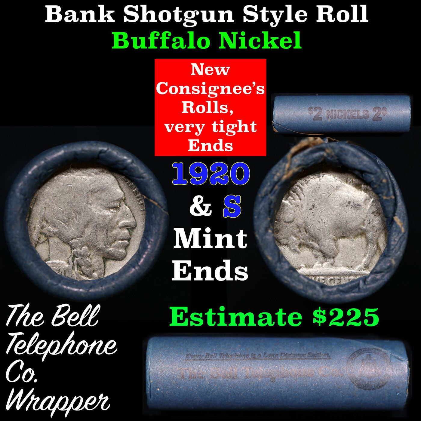 Buffalo Nickel Shotgun Roll in Old Bank Style 'Bell Telephone' Wrapper 1920 &s Mint Ends. The roll is held in an old, rare "Bell Telephone Co." Bank style wrapper. This is the Bell Telephone logo from the 1960's. They are all frrom one Estate. The ends on these rolls are very tight. We will guarantee they are all full dates.
