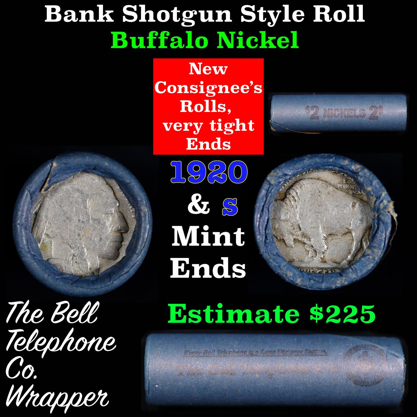 Buffalo Nickel Shotgun Roll in Old Bank Style 'Bell Telephone' Wrapper 1920 &s Mint Ends. The roll is held in an old, rare "Bell Telephone Co." Bank style wrapper. This is the Bell Telephone logo from the 1960's. They are all frrom one Estate. The ends on these rolls are very tight. We will guarantee they are all full dates.