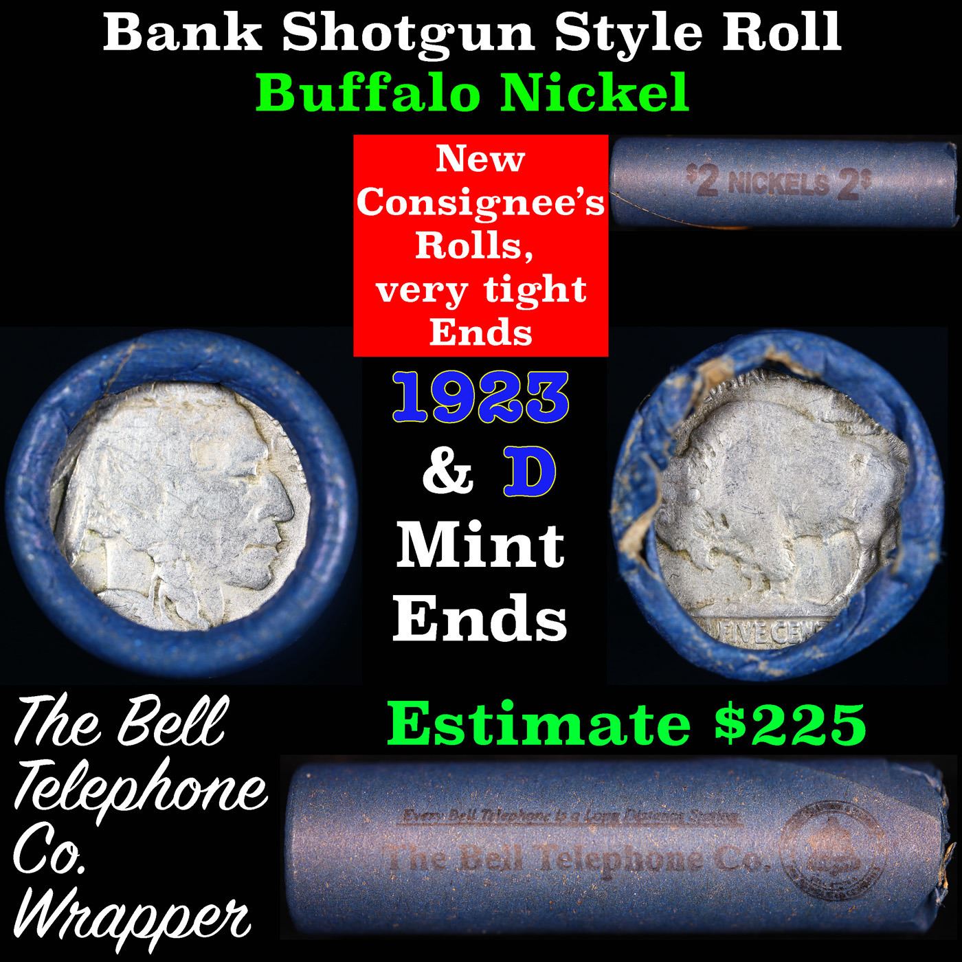 Buffalo Nickel Shotgun Roll in Old Bank Style 'Bell Telephone' Wrapper 1923 & D Mint Ends. The roll is held in an old, rare "Bell Telephone Co." Bank style wrapper. This is the Bell Telephone logo from the 1960's. They are all frrom one Estate. The ends on these rolls are very tight. We will guarantee they are all full dates.