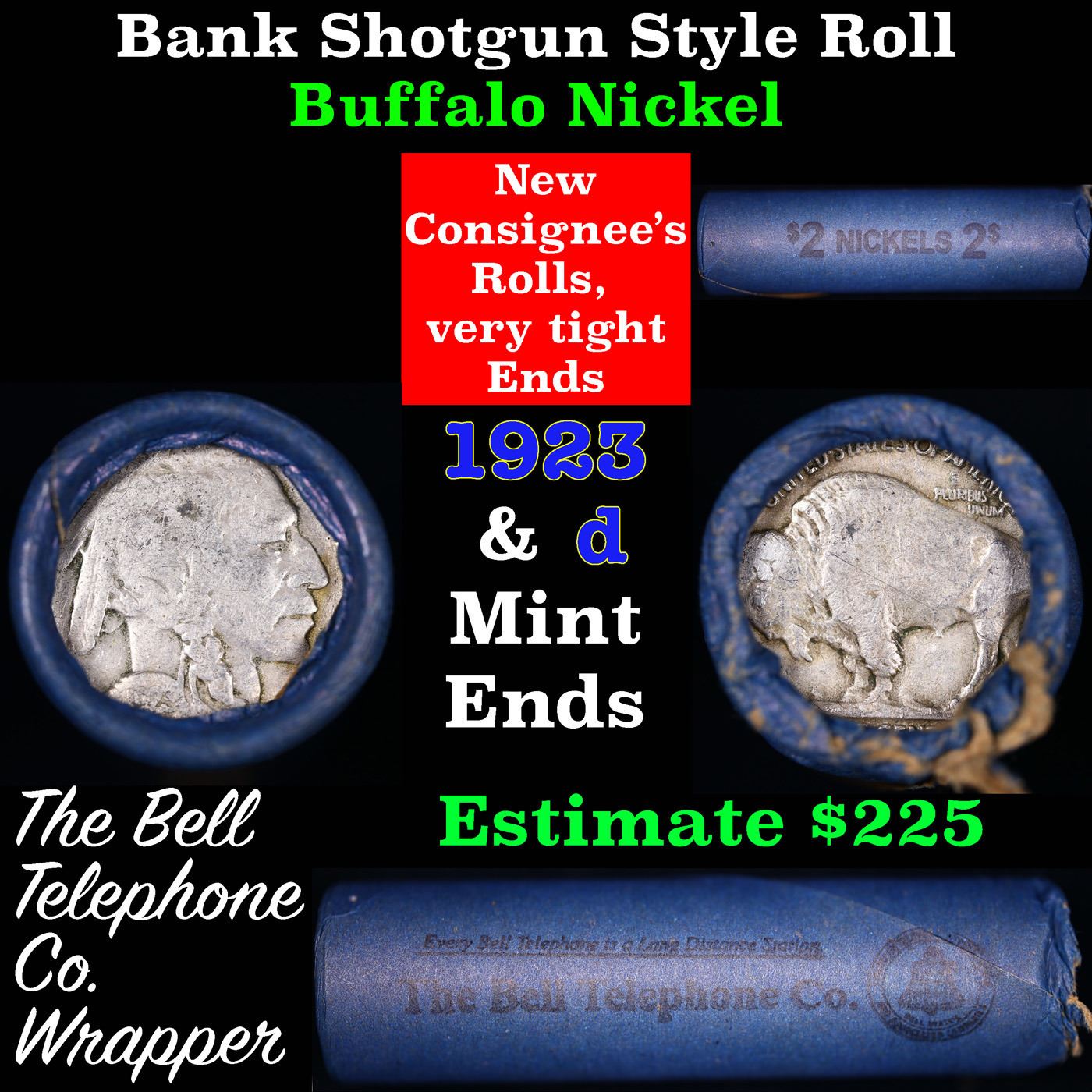 Buffalo Nickel Shotgun Roll in Old Bank Style 'Bell Telephone' Wrapper 1923 & D Mint Ends. The roll is held in an old, rare "Bell Telephone Co." Bank style wrapper. This is the Bell Telephone logo from the 1960's. They are all frrom one Estate. The ends on these rolls are very tight. We will guarantee they are all full dates.