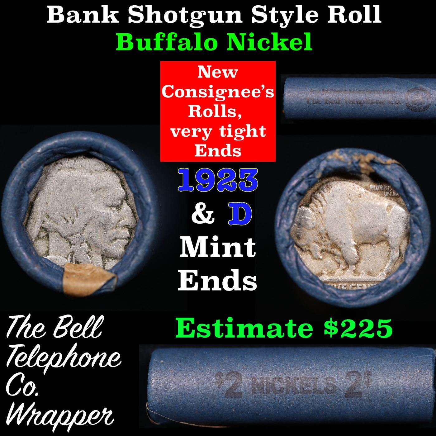 Buffalo Nickel Shotgun Roll in Old Bank Style 'Bell Telephone' Wrapper 1923 & D Mint Ends. The roll is held in an old, rare "Bell Telephone Co." Bank style wrapper. This is the Bell Telephone logo from the 1960's. They are all frrom one Estate. The ends on these rolls are very tight. We will guarantee they are all full dates.