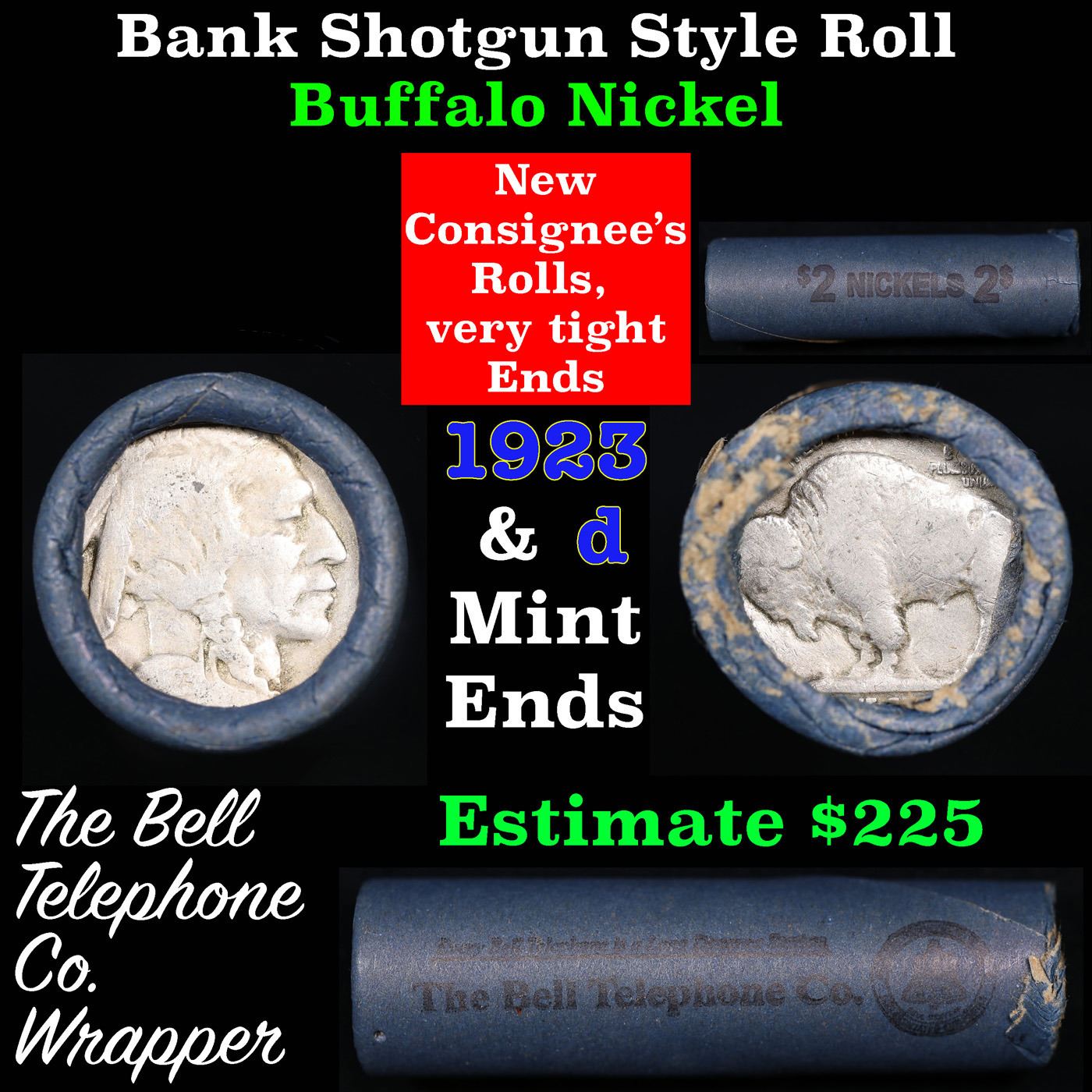 Buffalo Nickel Shotgun Roll in Old Bank Style 'Bell Telephone' Wrapper 1923 & D Mint Ends.. The roll is held in an old, rare "Bell Telephone Co." Bank style wrapper. This is the Bell Telephone logo from the 1960's. They are all frrom one Estate. The ends on these rolls are very tight. We will guarantee they are all full dates.