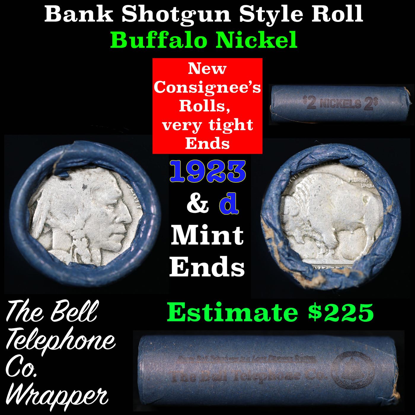 Buffalo Nickel Shotgun Roll in Old Bank Style 'Bell Telephone' Wrapper 1923 & D Mint Ends.. The roll is held in an old, rare "Bell Telephone Co." Bank style wrapper. This is the Bell Telephone logo from the 1960's. They are all frrom one Estate. The ends on these rolls are very tight. We will guarantee they are all full dates.