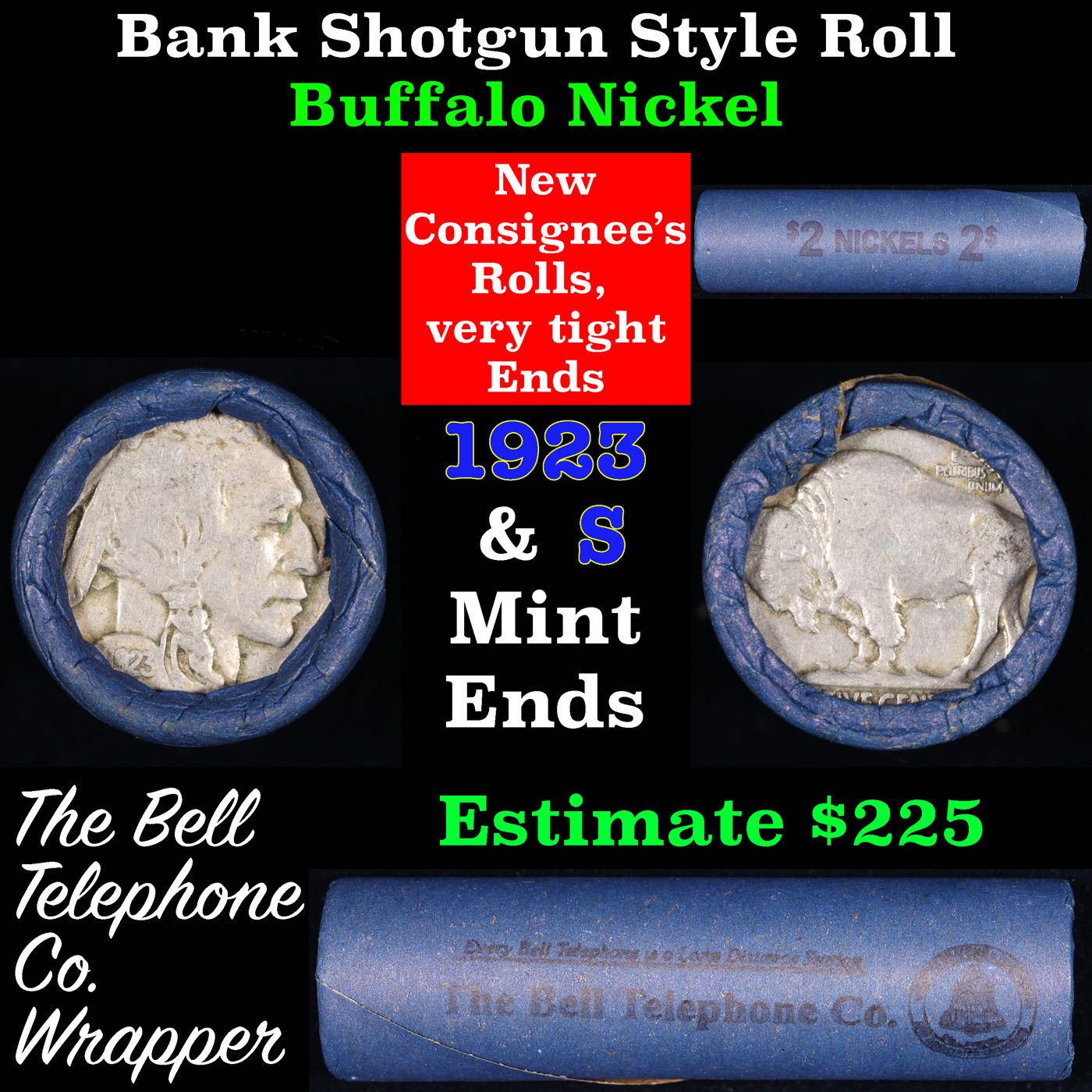 Buffalo Nickel Shotgun Roll in Old Bank Style 'Bell Telephone' Wrapper 1923 & S Mint Ends. The roll is held in an old, rare "Bell Telephone Co." Bank style wrapper. This is the Bell Telephone logo from the 1960's. They are all frrom one Estate. The ends on these rolls are very tight. We will guarantee they are all full dates.