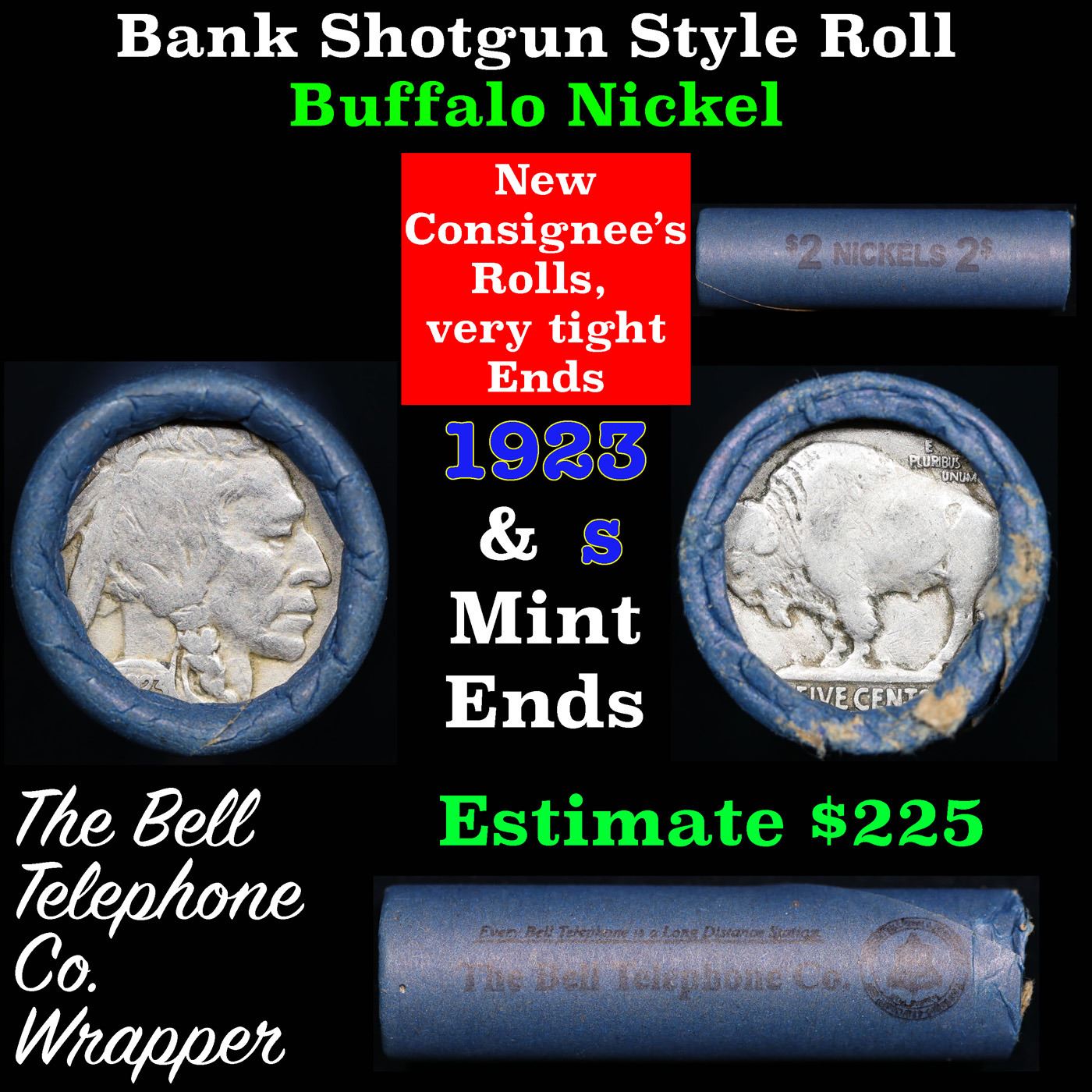 Buffalo Nickel Shotgun Roll in Old Bank Style 'Bell Telephone' Wrapper 1923 & S Mint Ends. The roll is held in an old, rare "Bell Telephone Co." Bank style wrapper. This is the Bell Telephone logo from the 1960's. They are all frrom one Estate. The ends on these rolls are very tight. We will guarantee they are all full dates.