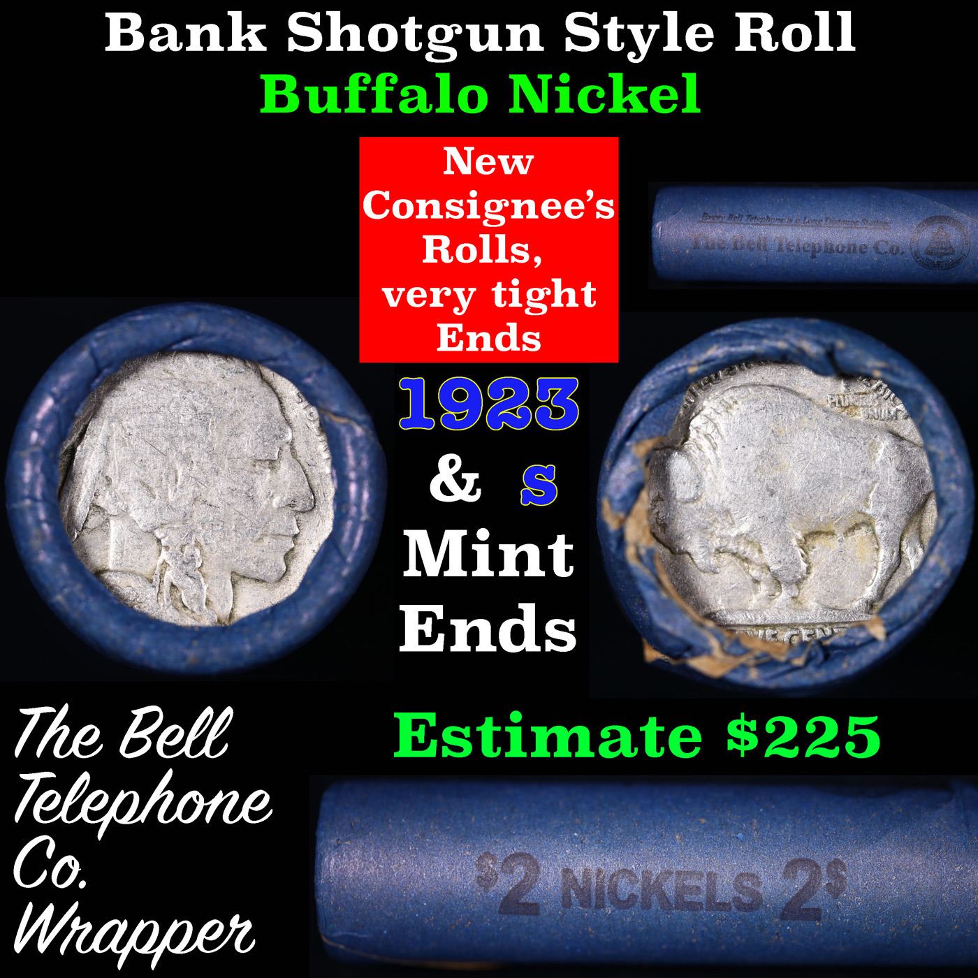 Buffalo Nickel Shotgun Roll in Old Bank Style 'Bell Telephone' Wrapper 1923 & S Mint Ends. The roll is held in an old, rare "Bell Telephone Co." Bank style wrapper. This is the Bell Telephone logo from the 1960's. They are all frrom one Estate. The ends on these rolls are very tight. We will guarantee they are all full dates.