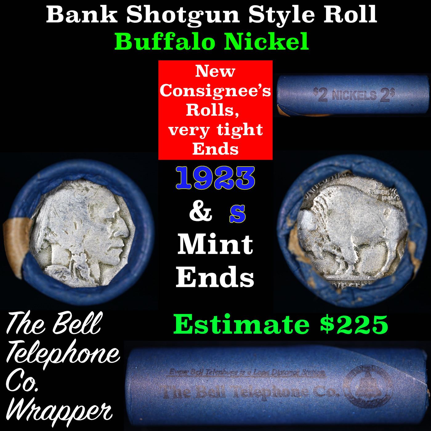 Buffalo Nickel Shotgun Roll in Old Bank Style 'Bell Telephone' Wrapper 1923 & S Mint Ends. The roll is held in an old, rare "Bell Telephone Co." Bank style wrapper. This is the Bell Telephone logo from the 1960's. They are all frrom one Estate. The ends on these rolls are very tight. We will guarantee they are all full dates.