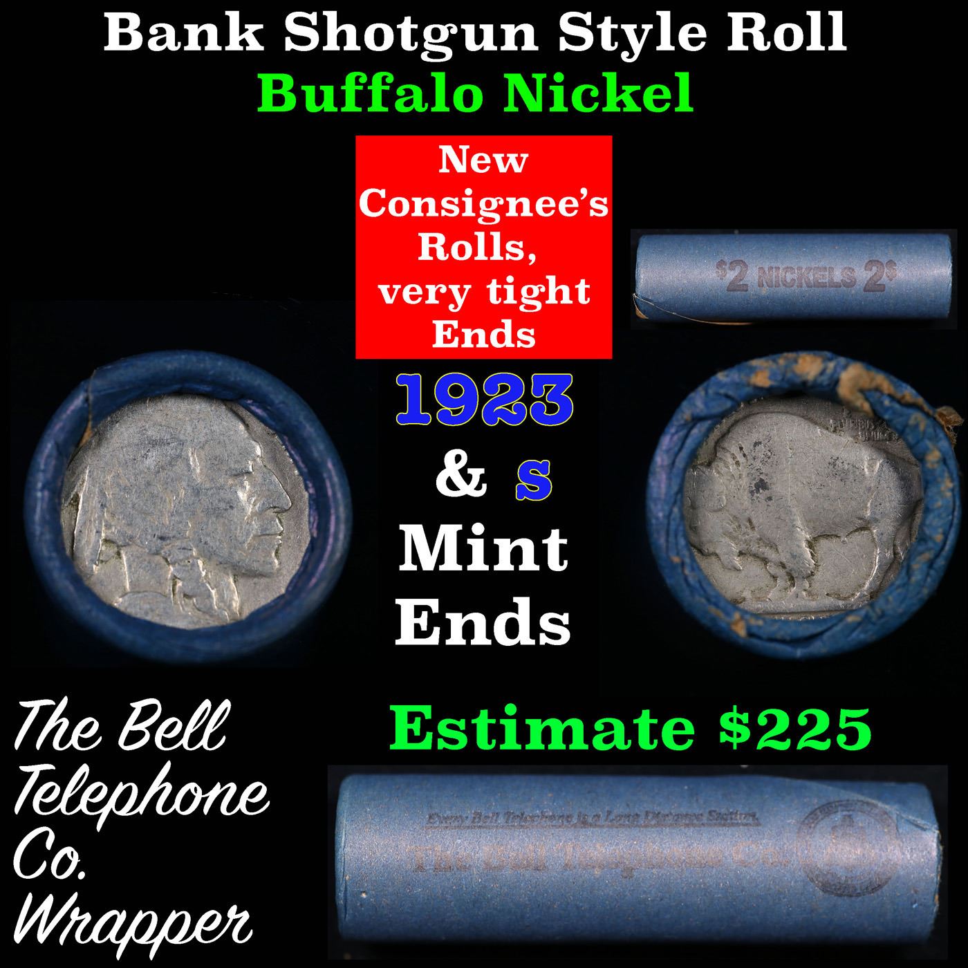 Buffalo Nickel Shotgun Roll in Old Bank Style 'Bell Telephone' Wrapper 1923 & S Mint Ends.. The roll is held in an old, rare "Bell Telephone Co." Bank style wrapper. This is the Bell Telephone logo from the 1960's. They are all frrom one Estate. The ends on these rolls are very tight. We will guarantee they are all full dates.