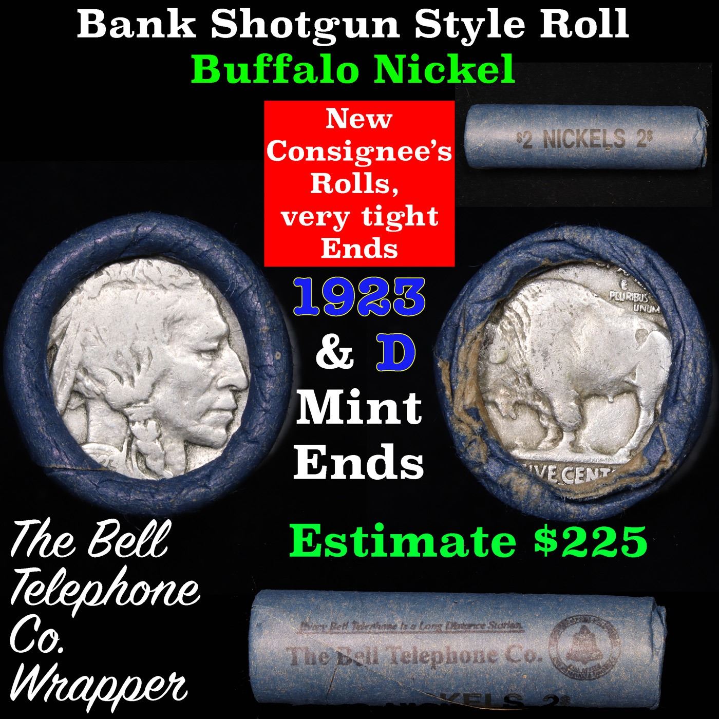 Buffalo Nickel Shotgun Roll in Old Bank Style 'Bell Telephone' Wrapper 1923 & d Mint Ends Grades. The roll is held in an old, rare "Bell Telephone Co." Bank style wrapper. This is the Bell Telephone logo from the 1960's. They are all frrom one Estate. The ends on these rolls are very tight. We will guarantee they are all full dates.