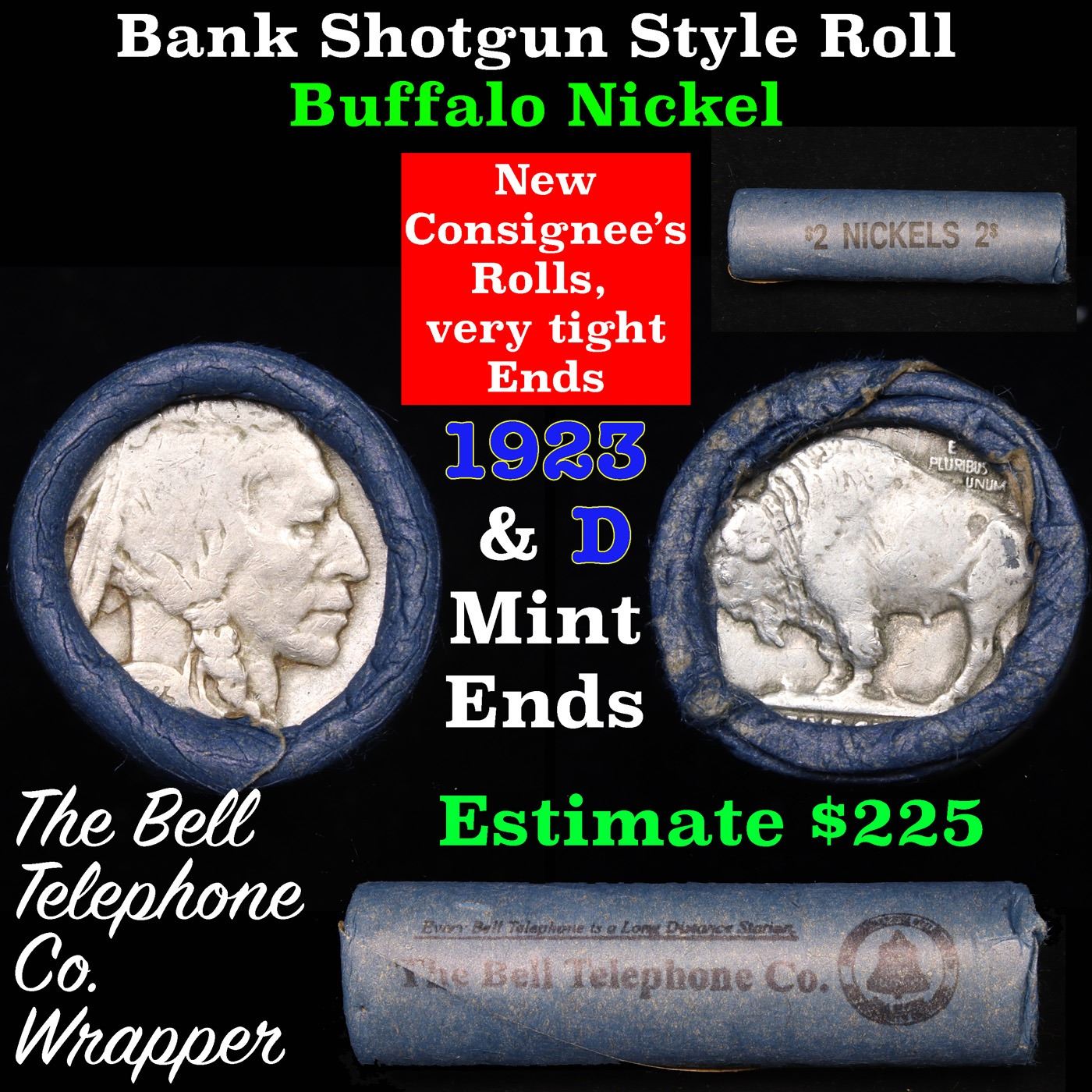 Buffalo Nickel Shotgun Roll in Old Bank Style 'Bell Telephone' Wrapper 1923 & d Mint Ends Grades. The roll is held in an old, rare "Bell Telephone Co." Bank style wrapper. This is the Bell Telephone logo from the 1960's. They are all frrom one Estate. The ends on these rolls are very tight. We will guarantee they are all full dates.