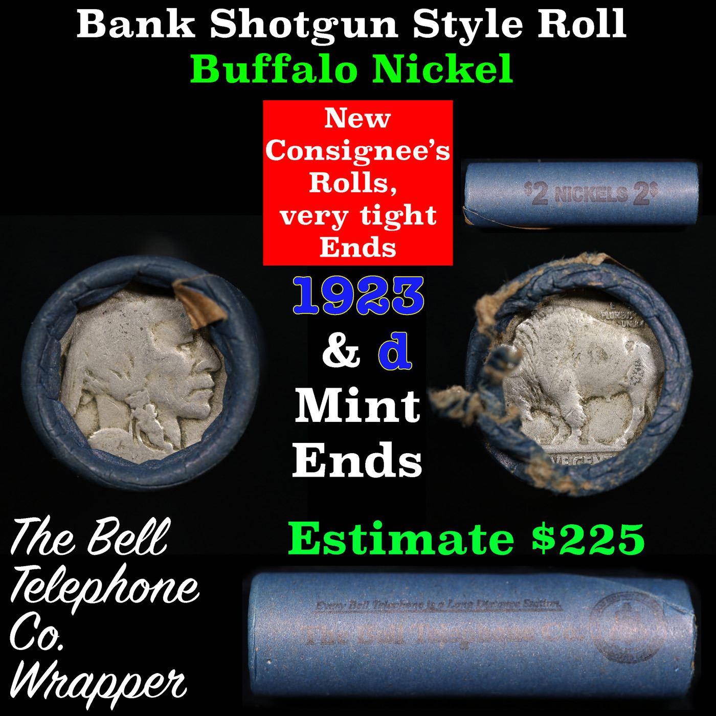 Buffalo Nickel Shotgun Roll in Old Bank Style 'Bell Telephone' Wrapper 1923 &d Mint Ends Grades. The roll is held in an old, rare "Bell Telephone Co." Bank style wrapper. This is the Bell Telephone logo from the 1960's. They are all frrom one Estate. The ends on these rolls are very tight. We will guarantee they are all full dates.