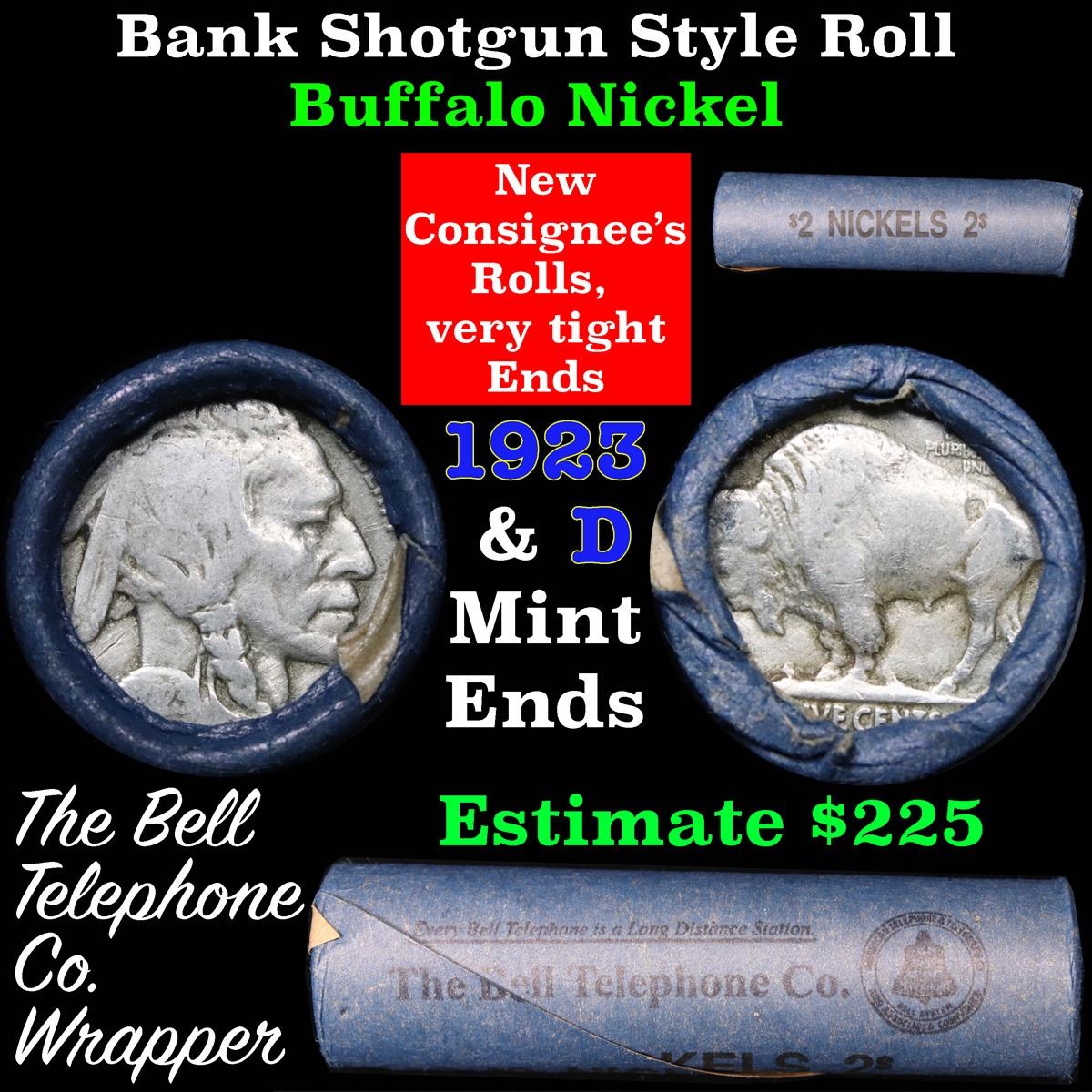 Buffalo Nickel Shotgun Roll in Old Bank Style 'Bell Telephone' Wrapper 1923 & d Mint Ends . .. The roll is held in an old, rare "Bell Telephone Co." Bank style wrapper. This is the Bell Telephone logo from the 1960's. They are all frrom one Estate. The ends on these rolls are very tight. We will guarantee they are all full dates.