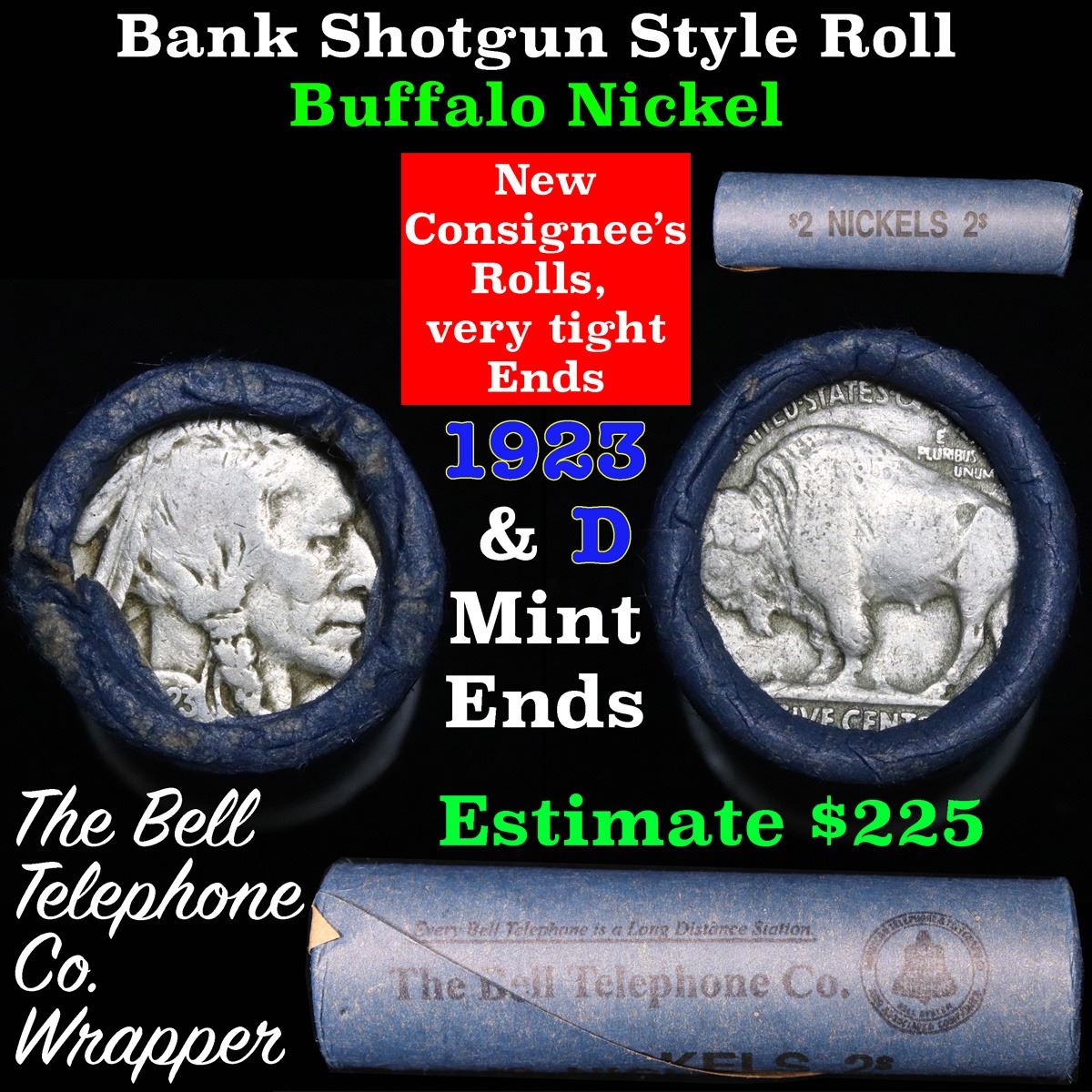 Buffalo Nickel Shotgun Roll in Old Bank Style 'Bell Telephone' Wrapper 1923& d Mint Ends. The roll is held in an old, rare "Bell Telephone Co." Bank style wrapper. This is the Bell Telephone logo from the 1960's. They are all frrom one Estate. The ends on these rolls are very tight. We will guarantee they are all full dates.