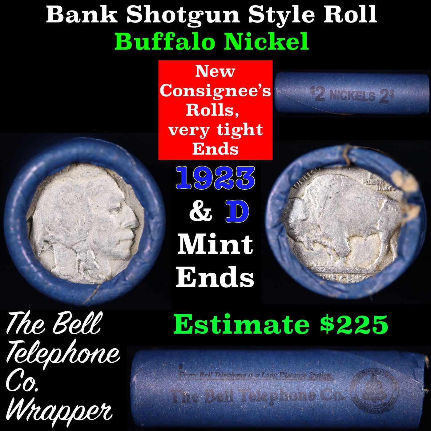 Buffalo Nickel Shotgun Roll in Old Bank Style 'Bell Telephone' Wrapper 1923 & d Mint Ends