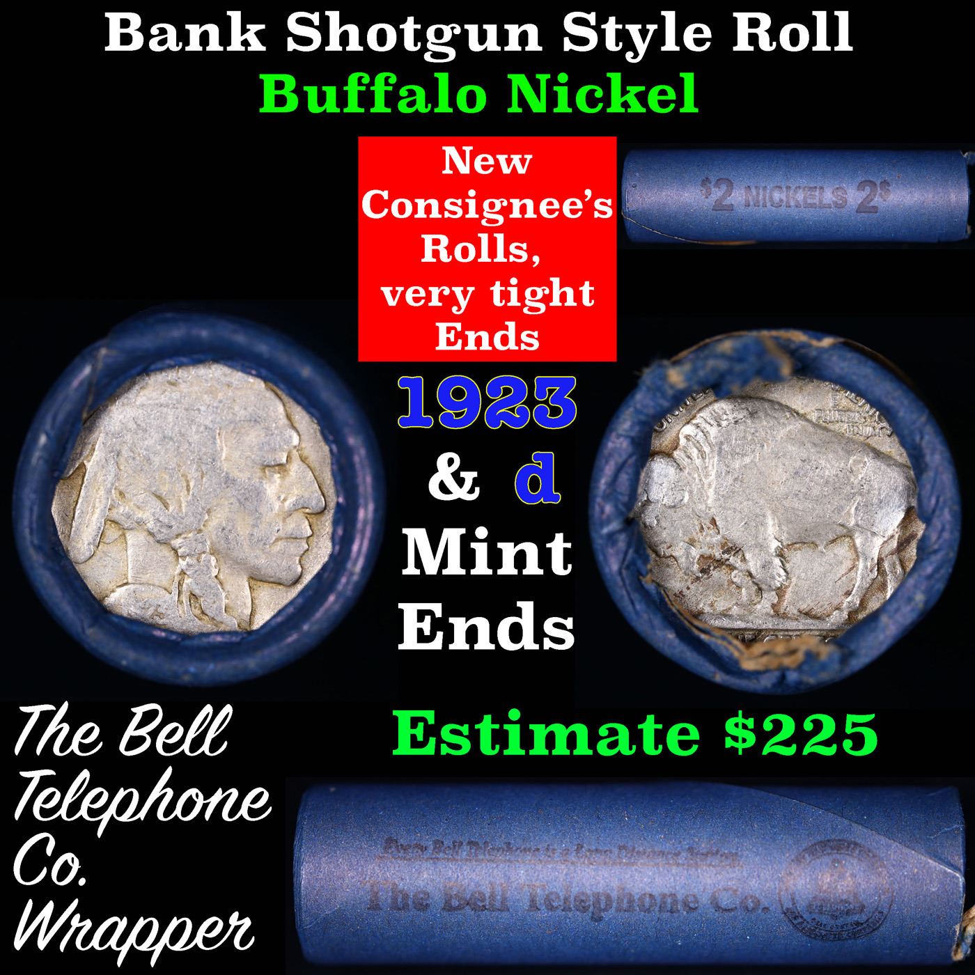 Buffalo Nickel Shotgun Roll in Old Bank Style 'Bell Telephone' Wrapper 1923 & d Mint Ends. The roll is held in an old, rare "Bell Telephone Co." Bank style wrapper. This is the Bell Telephone logo from the 1960's. They are all frrom one Estate. The ends on these rolls are very tight. We will guarantee they are all full dates.
