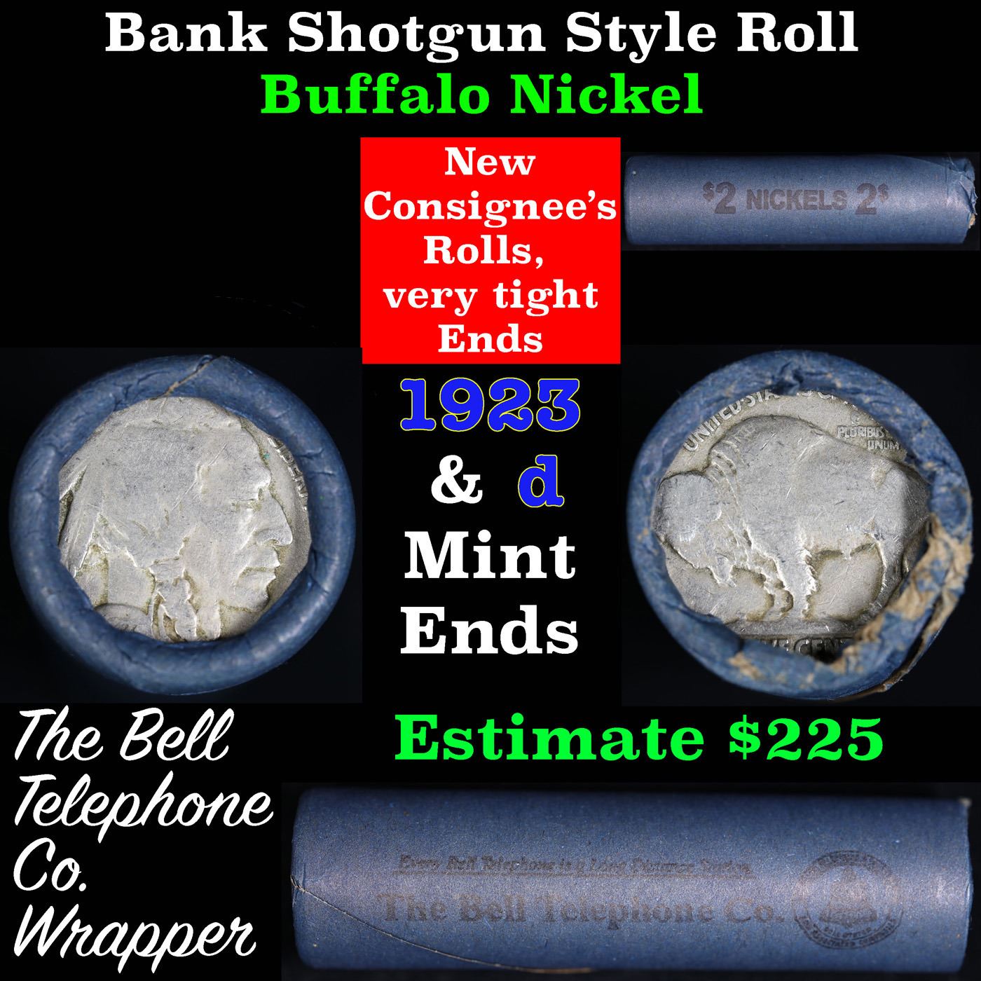 Buffalo Nickel Shotgun Roll in Old Bank Style 'Bell Telephone' Wrapper 1923 & d Mint Ends. The roll is held in an old, rare "Bell Telephone Co." Bank style wrapper. This is the Bell Telephone logo from the 1960's. They are all frrom one Estate. The ends on these rolls are very tight. We will guarantee they are all full dates.