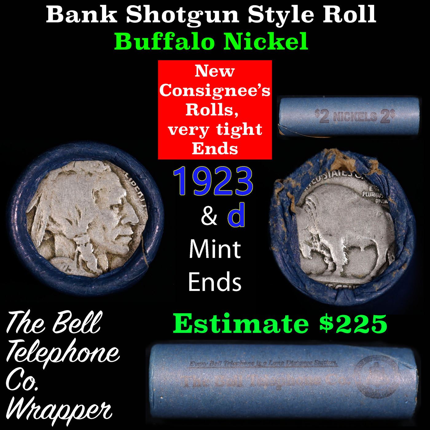 Buffalo Nickel Shotgun Roll in Old Bank Style 'Bell Telephone' Wrapper 1923 & d Mint Ends. The roll is held in an old, rare "Bell Telephone Co." Bank style wrapper. This is the Bell Telephone logo from the 1960's. They are all frrom one Estate. The ends on these rolls are very tight. We will guarantee they are all full dates.