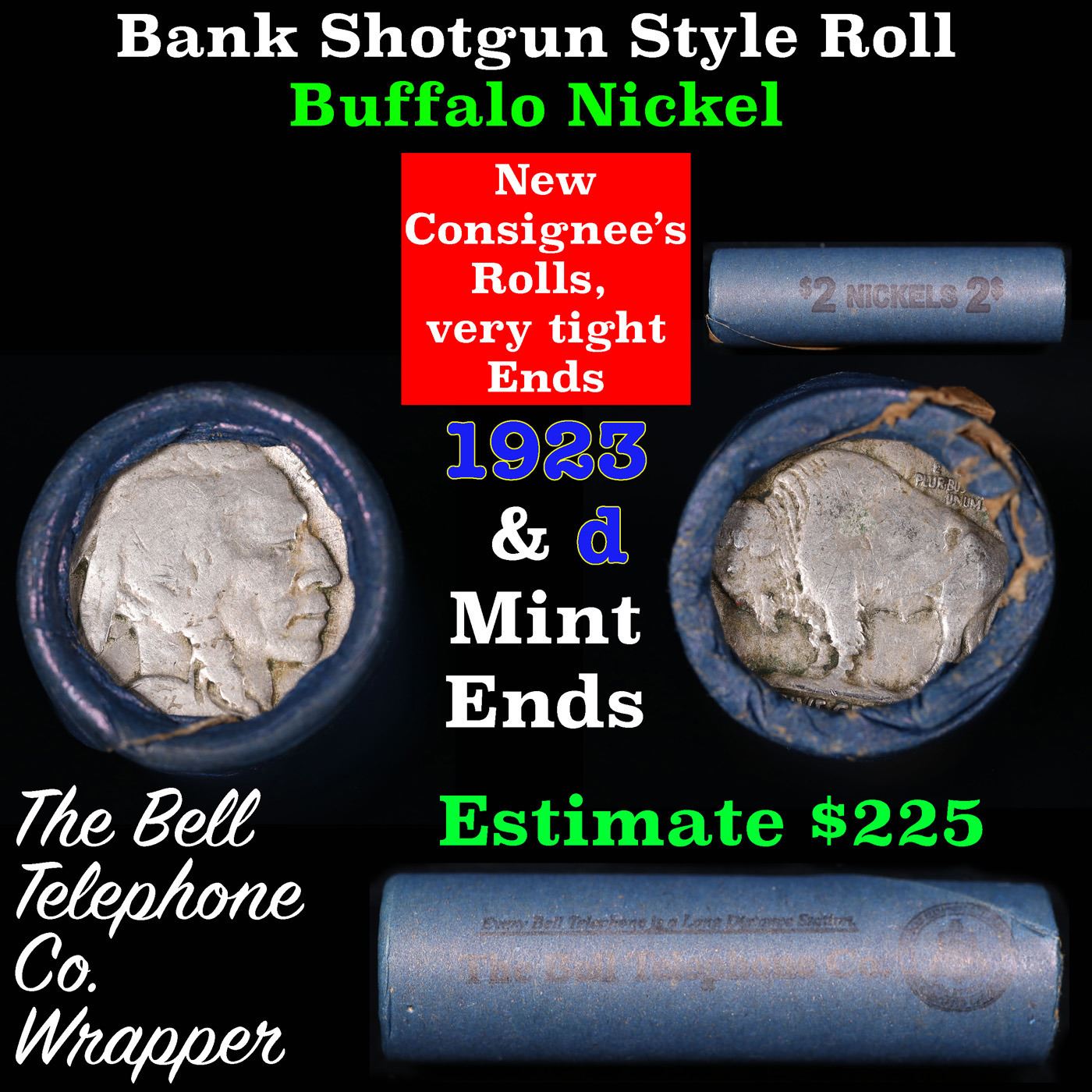 Buffalo Nickel Shotgun Roll in Old Bank Style 'Bell Telephone' Wrapper 1923 & d Mint Ends. The roll is held in an old, rare "Bell Telephone Co." Bank style wrapper. This is the Bell Telephone logo from the 1960's. They are all frrom one Estate. The ends on these rolls are very tight. We will guarantee they are all full dates.