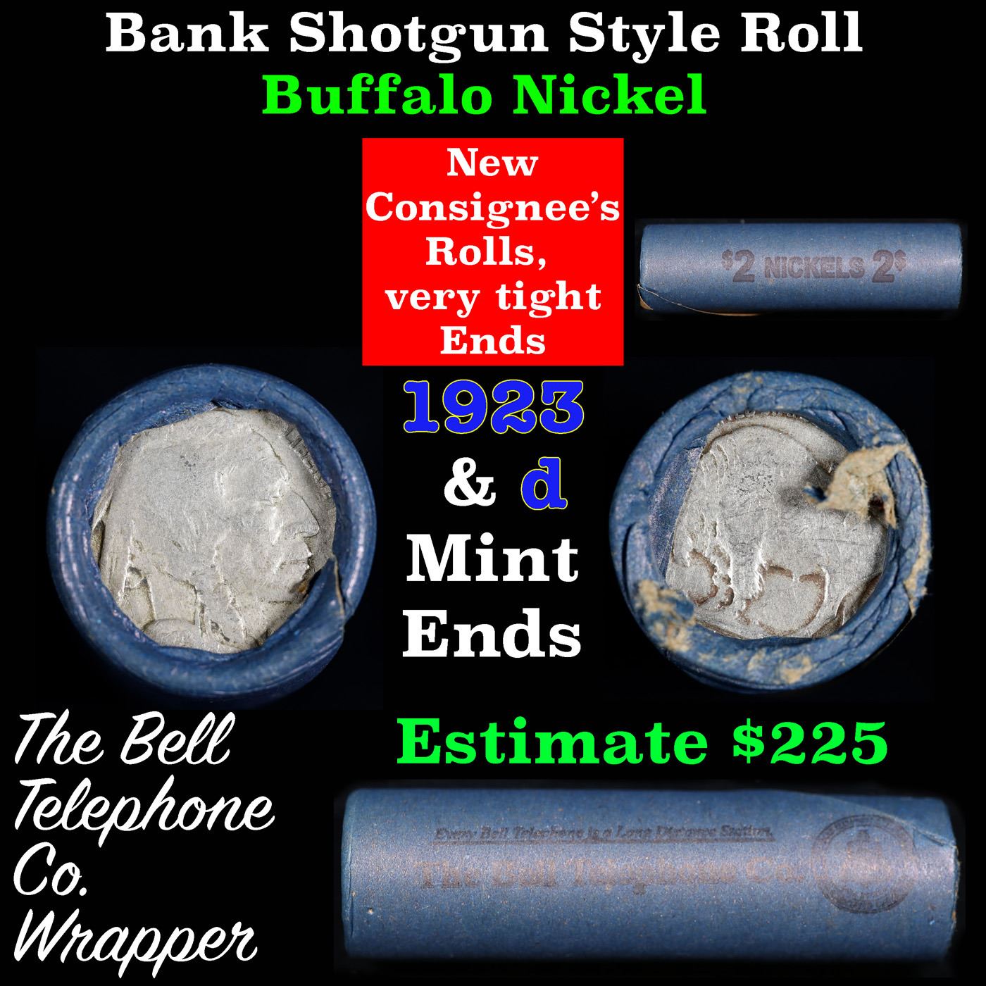 Buffalo Nickel Shotgun Roll in Old Bank Style 'Bell Telephone' Wrapper 1923 &d Mint Ends. The roll is held in an old, rare "Bell Telephone Co." Bank style wrapper. This is the Bell Telephone logo from the 1960's. They are all frrom one Estate. The ends on these rolls are very tight. We will guarantee they are all full dates.