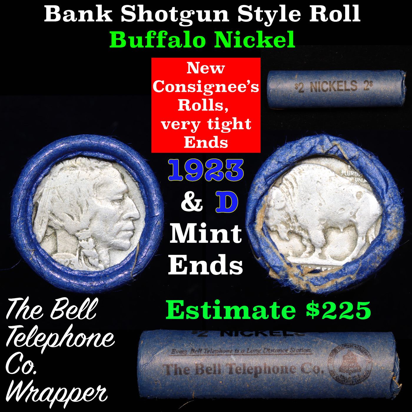 Buffalo Nickel Shotgun Roll in Old Bank Style 'Bell Telephone' Wrapper 1923 & d Mint Ends Grades. The roll is held in an old, rare "Bell Telephone" wrapper. Every Bell Telephone is a Long Distance station. They are all frrom one Estate. The ends on these rolls are very tight. We will guarantee they are all full dates.