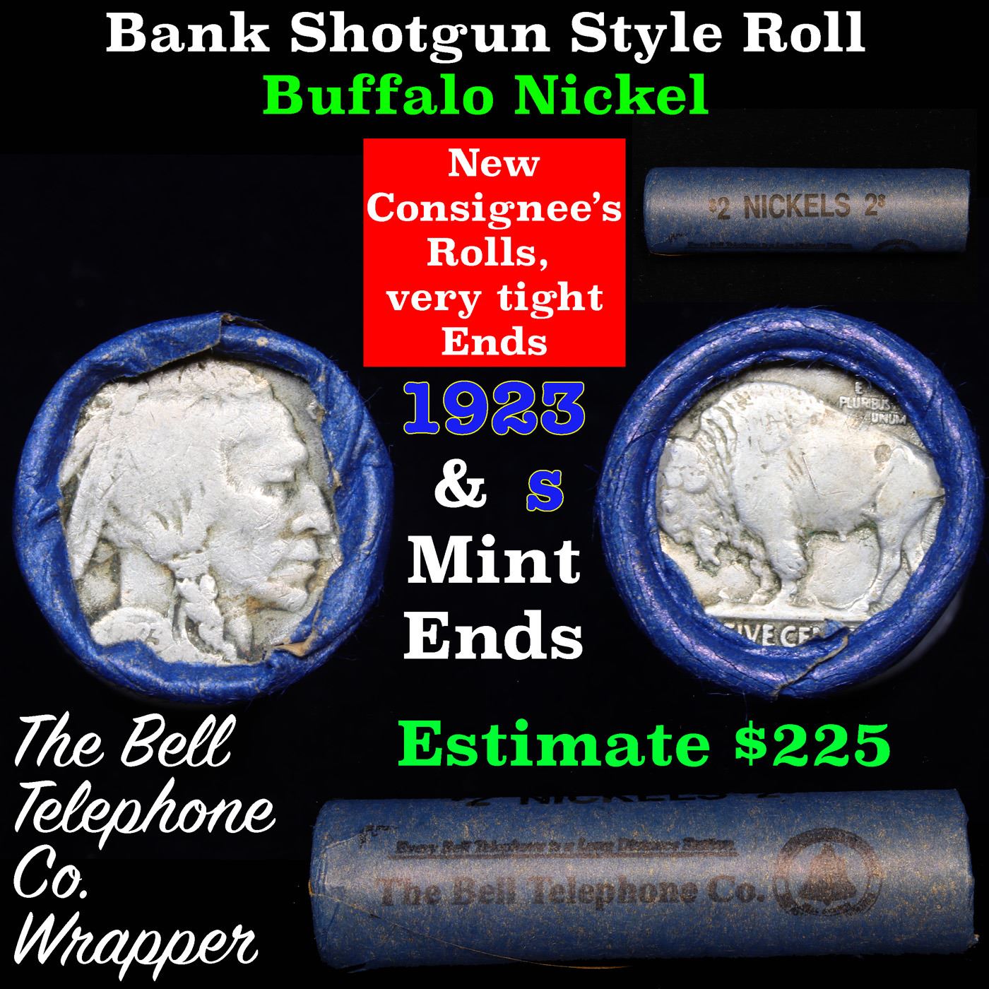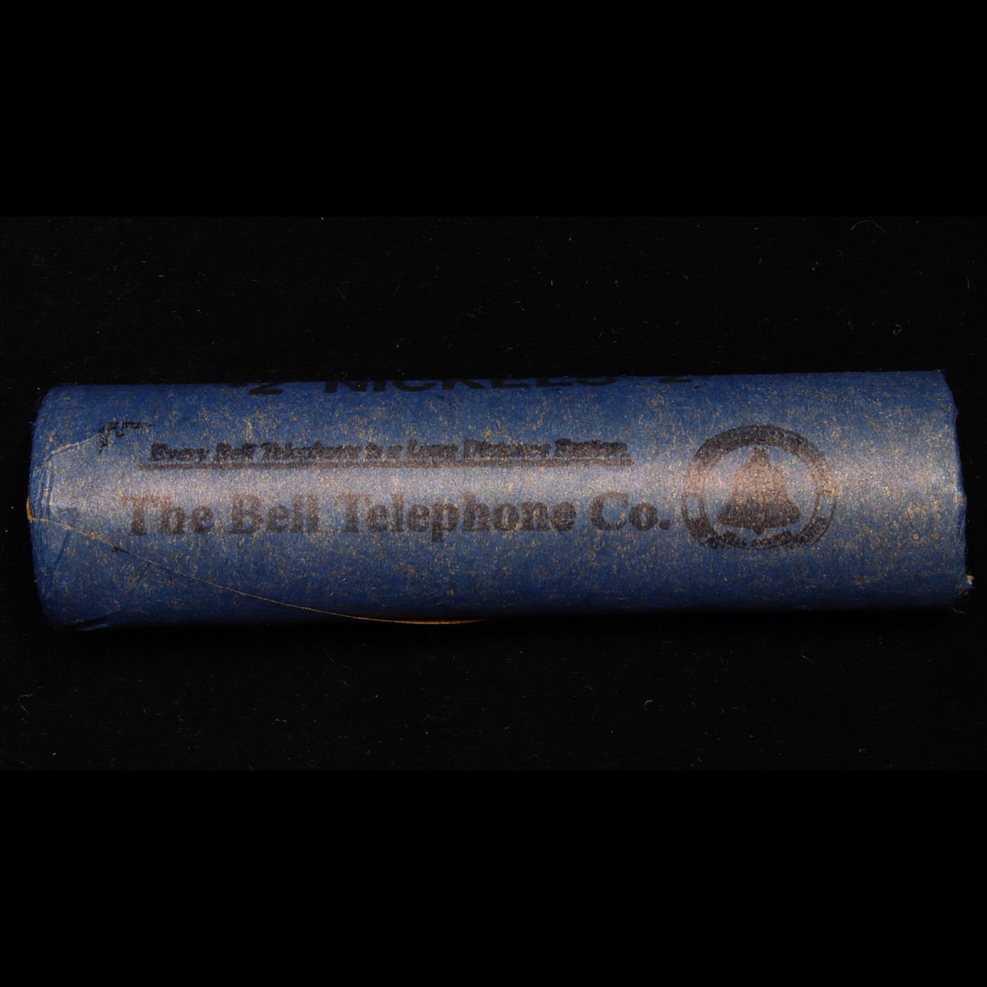 Buffalo Nickel Shotgun Roll in Old Bank Style Bell Telephone Wrapper 1923& s Mint Ends. The roll is held in an old, rare " Bell Telephone Wrapper." Bank style wrapper. They are all frrom one Estate. The ends on these rolls are very tight. We will guarantee they are all full dates.