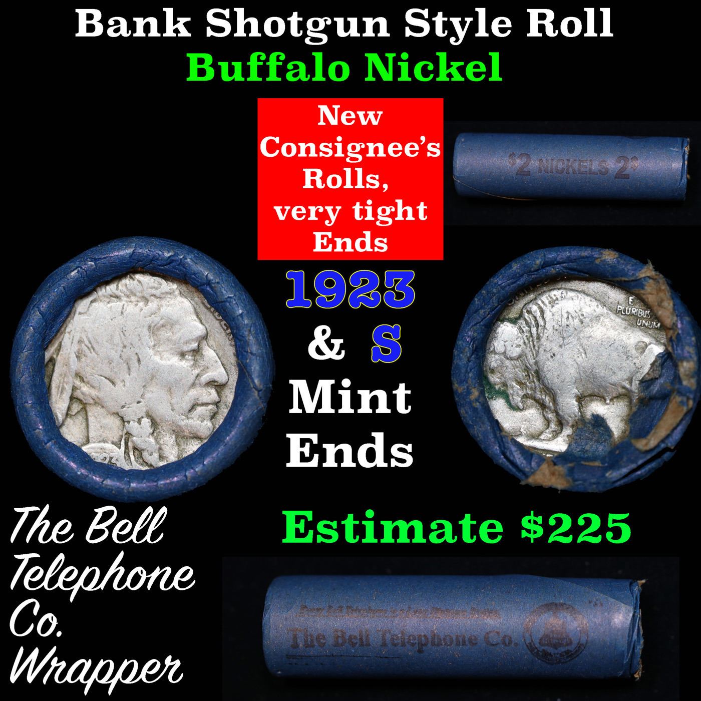 Buffalo Nickel Shotgun Roll in Old Bank Style 'Bell Telephone' Wrapper 1923 & s Mint Ends. The roll is held in an old, rare "Bell Telephone Co." Bank style wrapper. This is the Bell Telephone logo from the 1960's. They are all frrom one Estate. The ends on these rolls are very tight. We will guarantee they are all full dates.