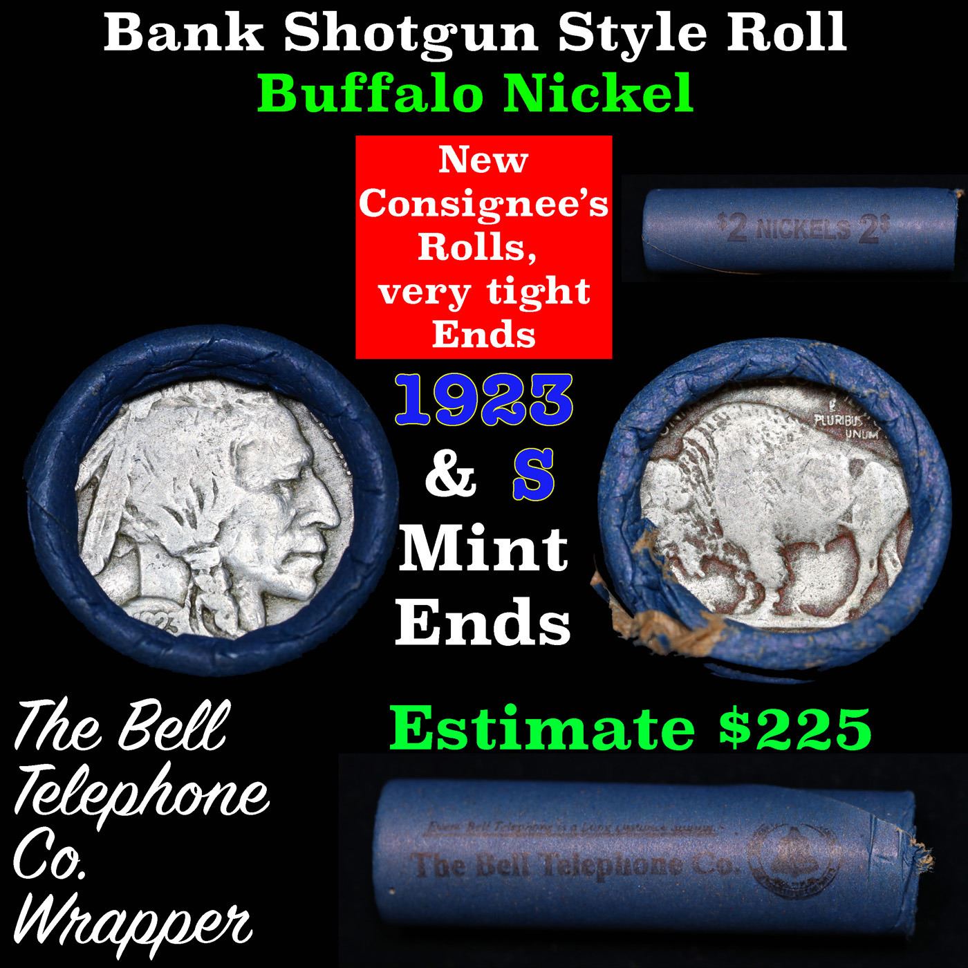 Buffalo Nickel Shotgun Roll in Old Bank Style 'Bell Telephone' Wrapper 1923 & s Mint Ends. The roll is held in an old, rare "Bell Telephone Co." Bank style wrapper. This is the Bell Telephone logo from the 1960's. They are all frrom one Estate. The ends on these rolls are very tight. We will guarantee they are all full dates.