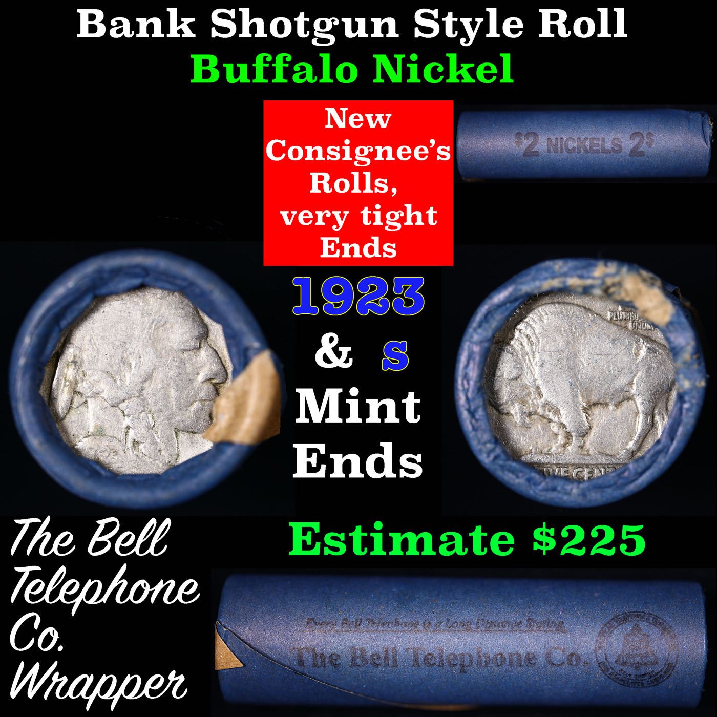 Buffalo Nickel Shotgun Roll in Old Bank Style 'Bell Telephone' Wrapper 1923 & s Mint Ends. 0 The roll is held in an old, rare "Bell Telephone Co." Bank style wrapper. This is the Bell Telephone logo from the 1960's. They are all frrom one Estate. The ends on these rolls are very tight. We will guarantee they are all full dates.