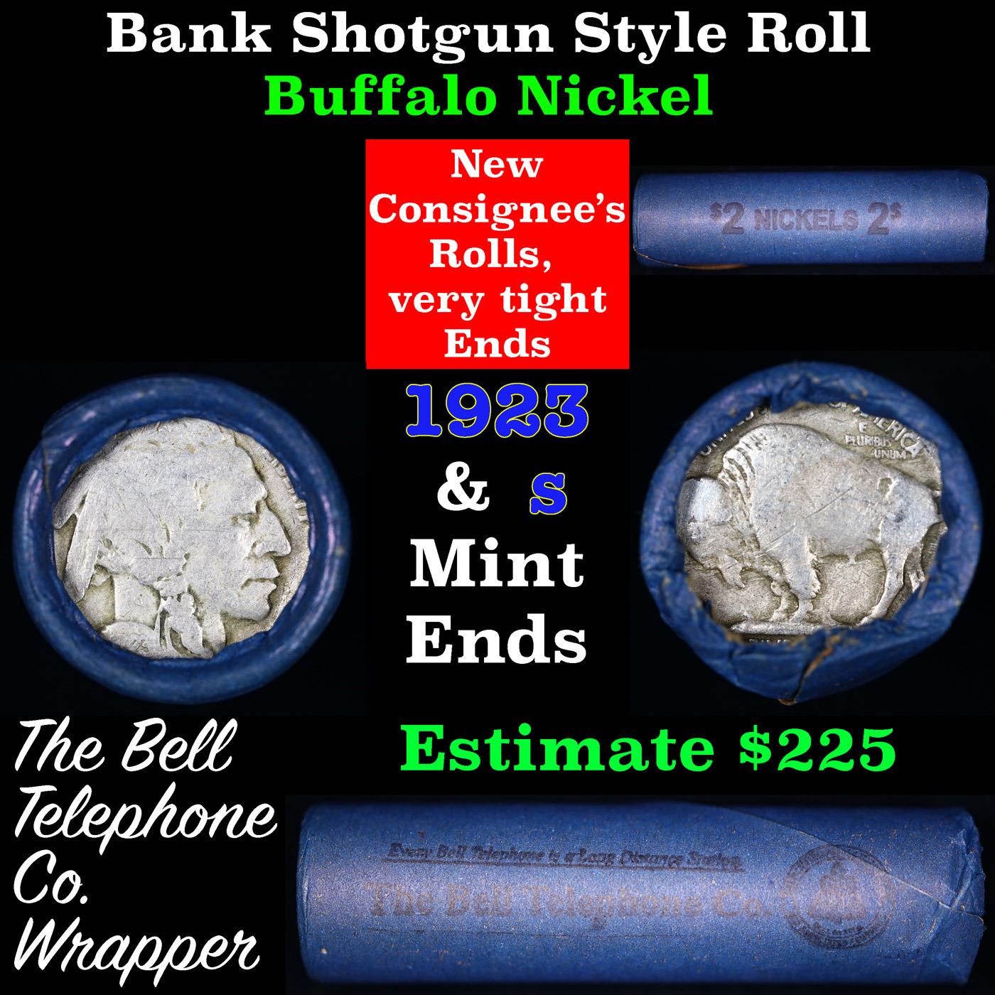 Buffalo Nickel Shotgun Roll in Old Bank Style 'Bell Telephone' Wrapper 1923 & s Mint Ends. The roll is held in an old, rare "Bell Telephone Co." Bank style wrapper. This is the Bell Telephone logo from the 1960's. They are all frrom one Estate. The ends on these rolls are very tight. We will guarantee they are all full dates.