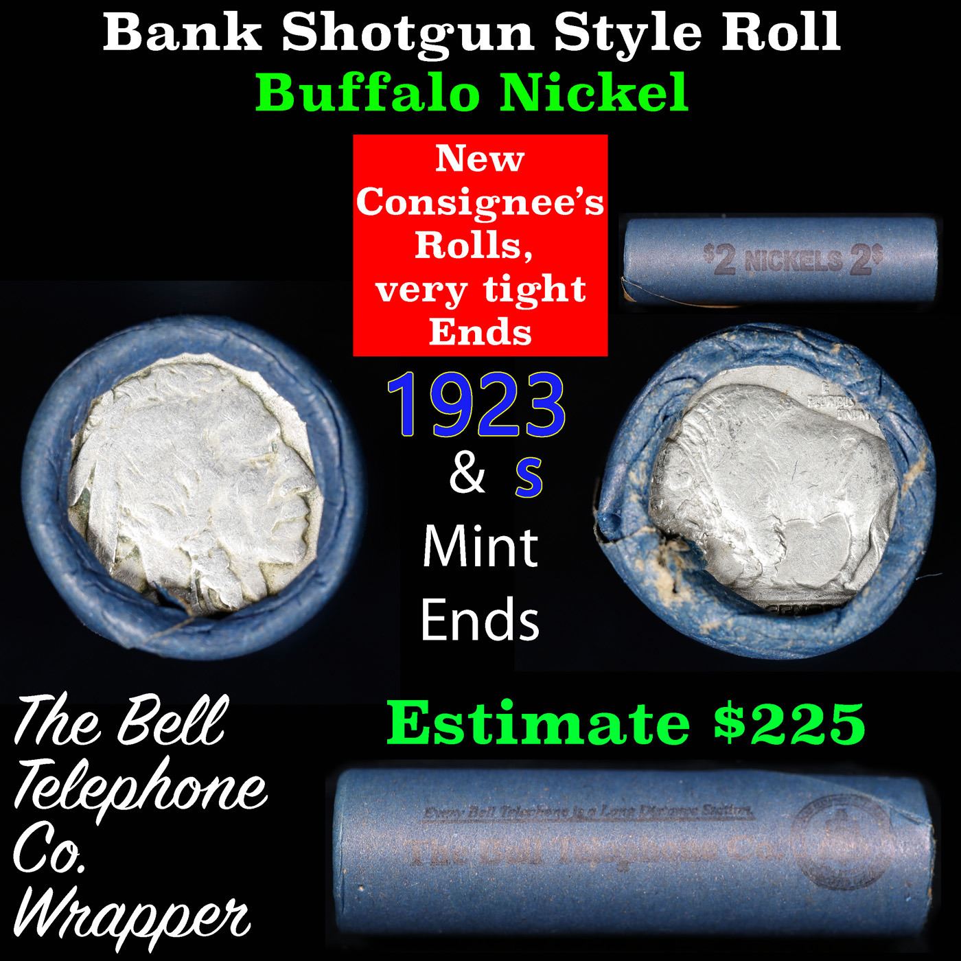 Buffalo Nickel Shotgun Roll in Old Bank Style 'Bell Telephone' Wrapper 1923 &s Mint Ends. The roll is held in an old, rare "Bell Telephone Co." Bank style wrapper. This is the Bell Telephone logo from the 1960's. They are all frrom one Estate. The ends on these rolls are very tight. We will guarantee they are all full dates.