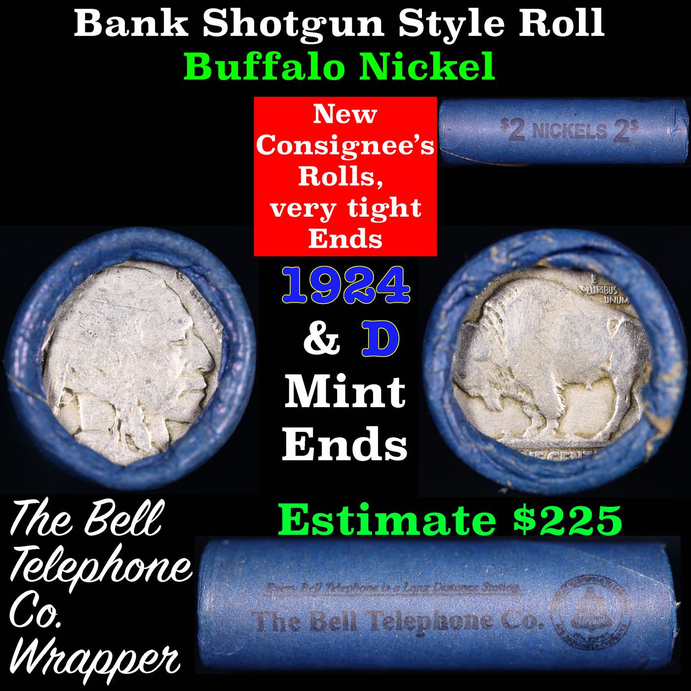 Buffalo Nickel Shotgun Roll in Old Bank Style 'Bell Telephone' Wrapper 1924 & D Mint Ends. The roll is held in an old, rare "Bell Telephone Co." Bank style wrapper. This is the Bell Telephone logo from the 1960's. They are all frrom one Estate. The ends on these rolls are very tight. We will guarantee they are all full dates.