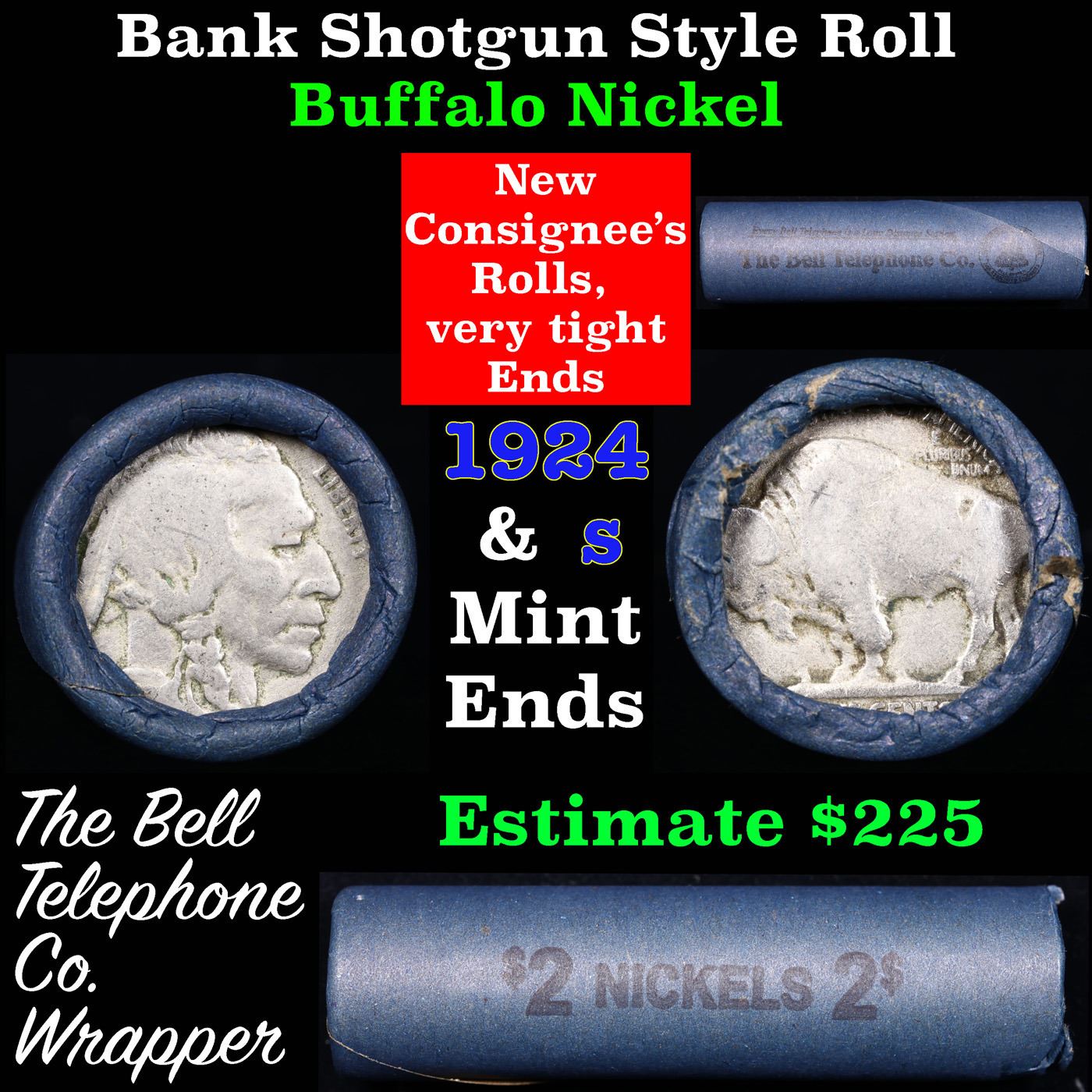 Buffalo Nickel Shotgun Roll in Old Bank Style 'Bell Telephone' Wrapper 1924 & S Mint Ends. The roll is held in an old, rare "Bell Telephone Co." Bank style wrapper. This is the Bell Telephone logo from the 1960's. They are all frrom one Estate. The ends on these rolls are very tight. We will guarantee they are all full dates.