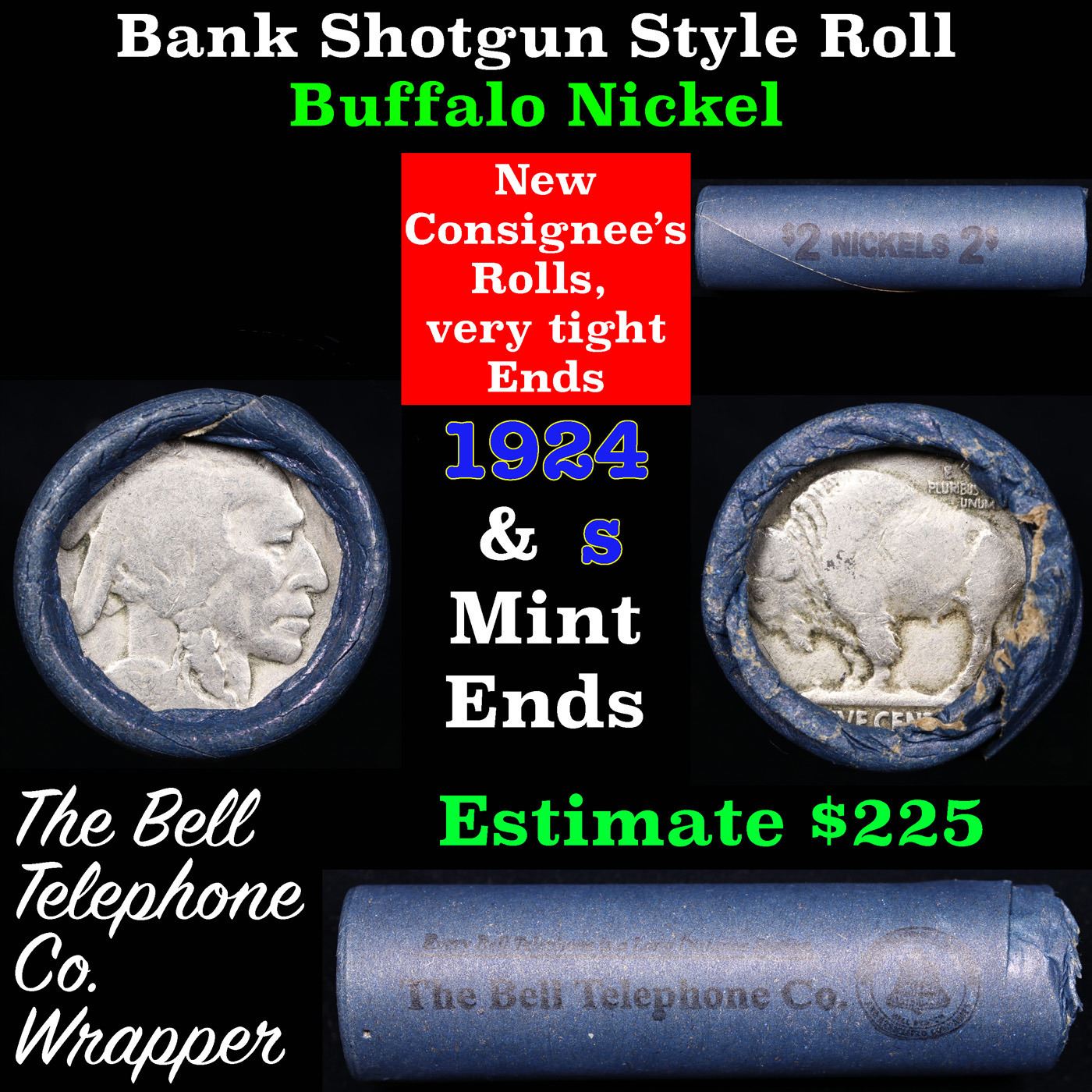 Buffalo Nickel Shotgun Roll in Old Bank Style 'Bell Telephone' Wrapper 1924 & S Mint Ends. The roll is held in an old, rare "Bell Telephone Co." Bank style wrapper. This is the Bell Telephone logo from the 1960's. They are all frrom one Estate. The ends on these rolls are very tight. We will guarantee they are all full dates.