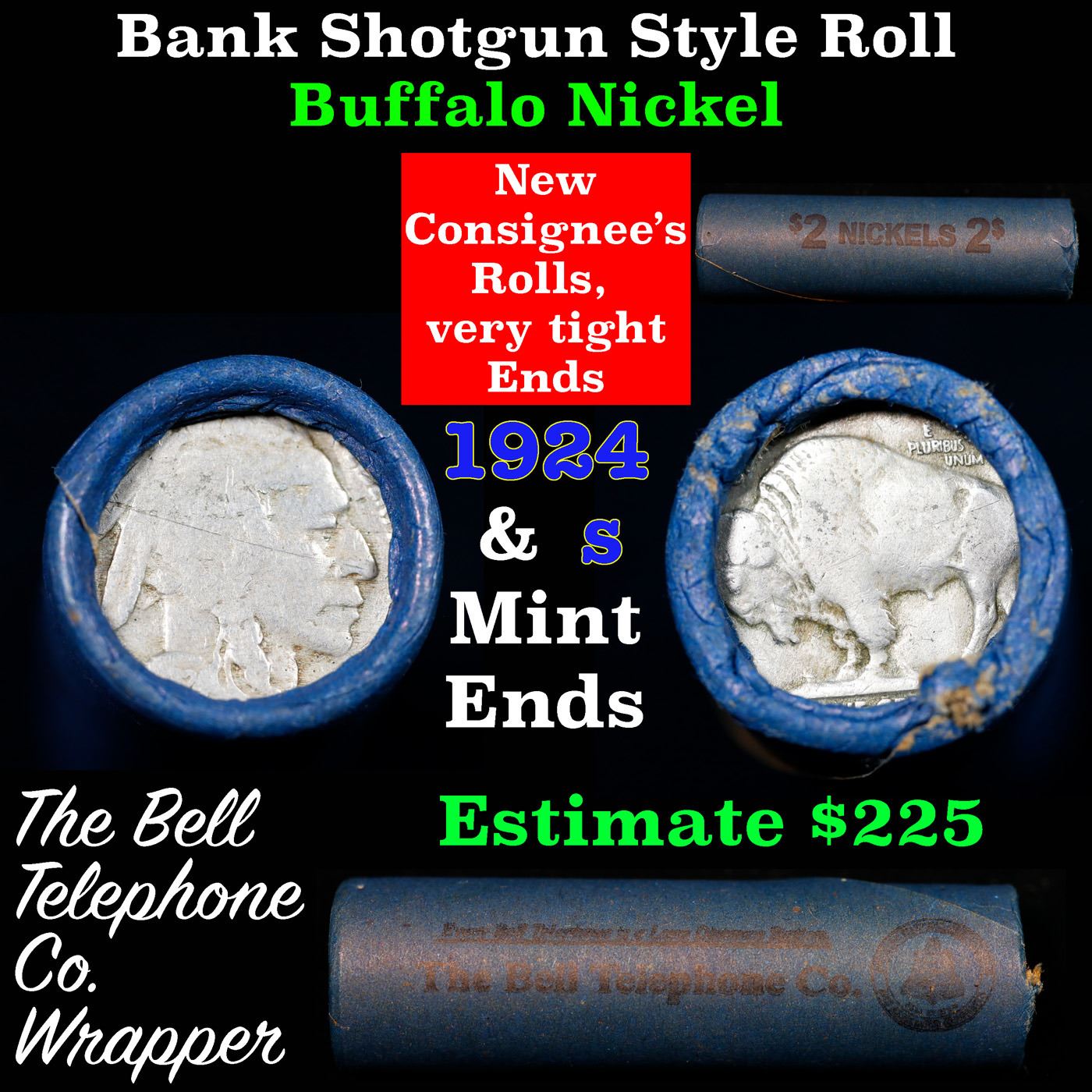 Buffalo Nickel Shotgun Roll in Old Bank Style 'Bell Telephone' Wrapper 1924 & S Mint Ends. The roll is held in an old, rare "Bell Telephone Co." Bank style wrapper. This is the Bell Telephone logo from the 1960's. They are all frrom one Estate. The ends on these rolls are very tight. We will guarantee they are all full dates.